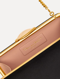 This timeless handbag captivates with its sleek, structured silhouette. Wrapped in luxurious satin, it's finished with Oscar de la Renta's iconic 'O' emblem and resin cabochon at the clasp—a nod to the House's storied heritage. With a gold-tone detachable chain link shoulder strap, this piece effortlessly transitions into a clutch. Details - Dimensions: 20 cm x 11 cm 4 cm - Weight: 395 grams - Chain Length 120 cm - Drop Length 55 cm - Lift-Up Closure - Detachable Chain Shoulder Strap - Blush Nappa Leather - Style Code: 00NH169SAT_BLK - Country of Origin: Italy Materials & Care - 90% Satin, 10% Brass
