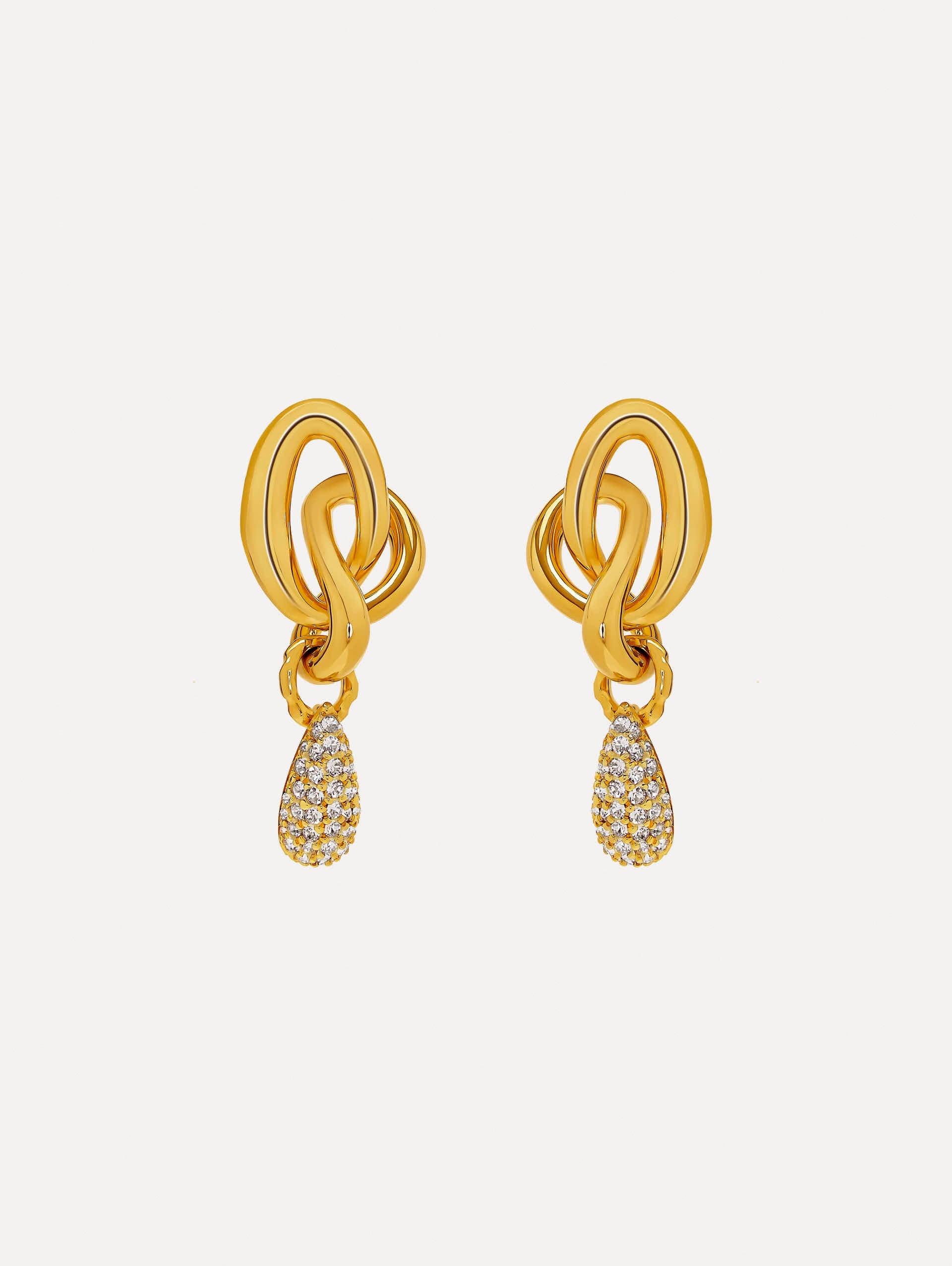 These gold earrings are delicately knotted into a fluid, sculptural design, subtly evoking the interlocking Oscar 'O' emblem in an abstract form. A delicate teardrop, adorned with pave crystals, elegantly suspends beneath. Details - Dimensions: 65 mm x 27 mm - Weight: 30 grams - Post Backs - For Pierced Ears - Style Code: P25J907_GOL - Country of Origin: Italy Materials & Care - 63% Copper, 30% Brass, 1% Bronze, 5% Glass, 1% Gold