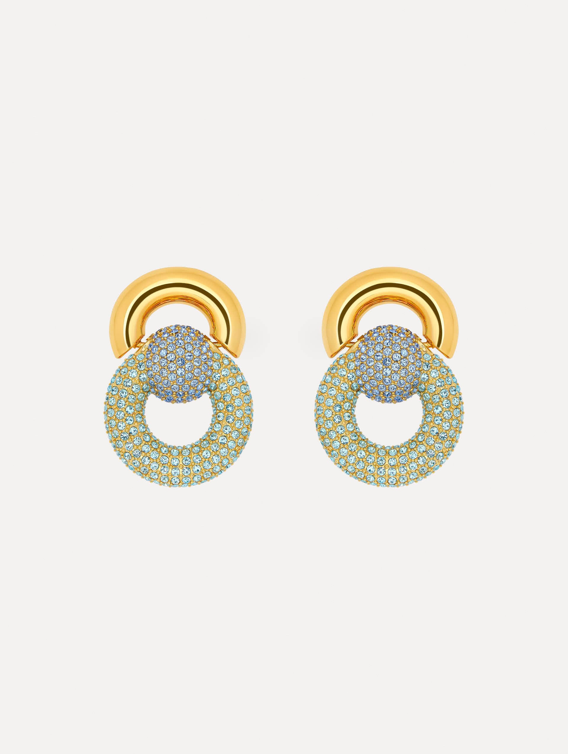 These sculptural drop earrings pair polished gold rings with pave-encrusted spheres. The bold, interlocked design brings a refined sense of structure and a striking shimmer to any look. Details - Dimensions: 29 mm x 27 mm - Weight: 23 grams - Clip Backs with Comfort Pads - European Glass Crystals - Style Code: F25J921_LSP - Country of Origin: Italy Materials & Care - - 97% Brass, 3% Crystal Glass - - Avoid exposing your jewelry to harsh chemicals. - - Lotions, cosmetics, hairspray and perfumes can cause chemical reactions that can cause the finish to deteriorate. - - Before handling, washing hands after applying makeup and hair products will help to preserve the finish. - - Do not wear in the pool, on the beach or in the shower. - - Wipe away dirt and body oils with a slightly damp microfiber jewelry cloth or cotton ball and allow to dry. - - Store separately in cloth pouches or small boxes to minimize scratching.