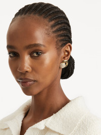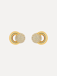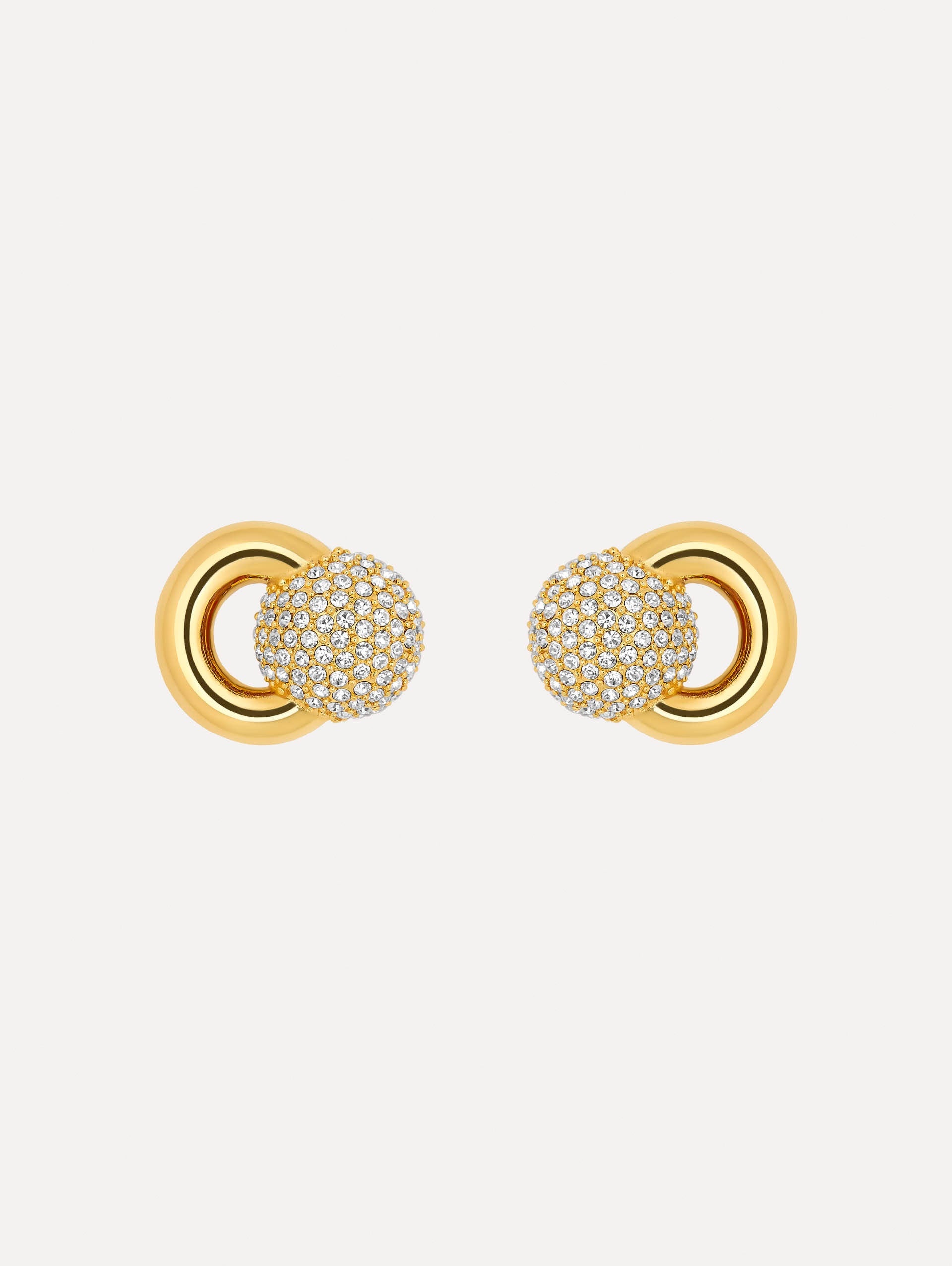 These sculptural stud earrings pair polished gold rings with pave-encrusted spheres. The bold, interlocked design brings a refined sense of structure and a striking shimmer to any look. Details - Dimensions: 2.5 cm x 2.2cm - Weight: 5 grams - Post Backs / For Pierced Ears / European Glass Crystals - Style Code: F25J941_CRT - Country of Origin: Italy Materials & Care - - 98% Brass, 2% Crystal Glass - - Avoid exposing your jewelry to harsh chemicals. - - Lotions, cosmetics, hairspray and perfumes can cause chemical reactions that can cause the finish to deteriorate. - - Before handling, washing hands after applying makeup and hair products will help to preserve the finish. - - Do not wear in the pool, on the beach or in the shower. - - Wipe away dirt and body oils with a slightly damp microfiber jewelry cloth or cotton ball and allow to dry. - - Store separately in cloth pouches or small boxes to minimize scratching.