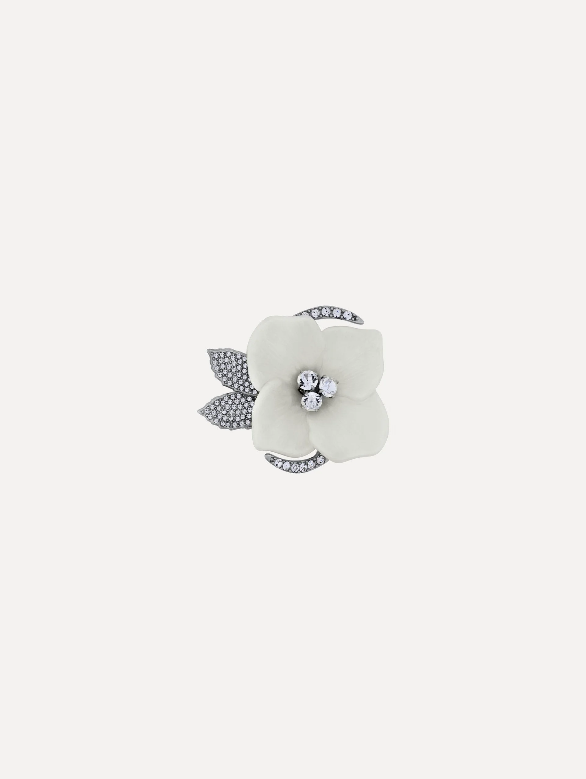 A single bloom, sculpted in luminous enamel and accented with crystal-set petals, defines this hair clip. At its heart, pearl-like stones radiate a soft, refined glow, while pave leaves trace a delicate frame. Pair with the coordinating earrings. Details - Dimensions: 5 cm x 5 cm - Weight: 27 grams - Pinch Clip - Country of Origin: Italy - Style Code: R26J510_CRT Materials & Care - 92% Brass, 2% Enamel, 3% Glass, 2% Resin, 1% Stee - Avoid exposing your jewelry to harsh chemicals. - Lotions, cosmetics, hairspray and perfumes can cause chemical reactions that can cause the finish to deteriorate. - Before handling, washing hands after applying makeup and hair products will help to preserve the finish. - Do not wear in the pool, on the beach or in the shower. - Wipe away dirt and body oils with a slightly damp microfiber jewelry cloth or cotton ball and allow to dry. - Store separately in cloth pouches or small boxes to minimize scratching.