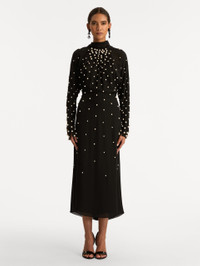 Lustrous pearls are delicately hand-applied across fluid silk georgette, creating a subtle interplay of texture and light. The softly draped silhouette, framed by long sleeves and a refined high neckline, exudes understated elegance. Details - Long Sleeves - Mock Neckline with Self-Tie Closure - Concealed Back Zipper - Center Back Slit - 100% Silk Lining - Country of Origin: Italy - Style Code: 26RE628GGT_BLK Materials & Care - 100% Silk - Spot clean only - Do not dry clean, iron, steam, bleach, or wash