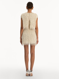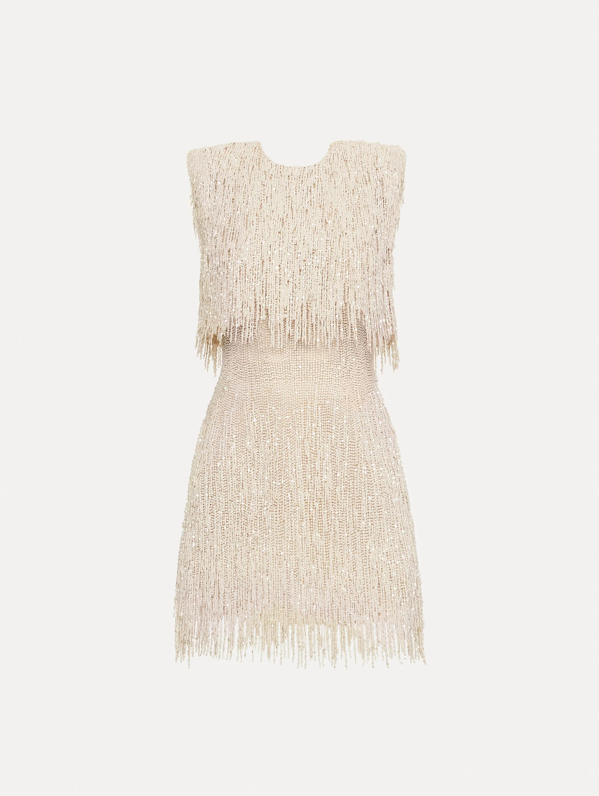 Playful yet opulent, this cocktail mini captures light and movement in every step. Cascading strands of faux pearls envelop the silhouette, from the full-fringe caraco bodice to the flared, cupcake-inspired skirt. The result is a study in texture and energy, balancing refined craftsmanship with spirited charm. Details - Sleeveless - Jewel Neckline - Cupcake Silhouette - Concealed Back Zipper - 100% Silk Lining - Country of Origin: USA - Style Code: 26RE630TUL_CRM Materials & Care - 100% Polyamide - Spot clean only - Do not dry clean, iron, steam, bleach, or wash
