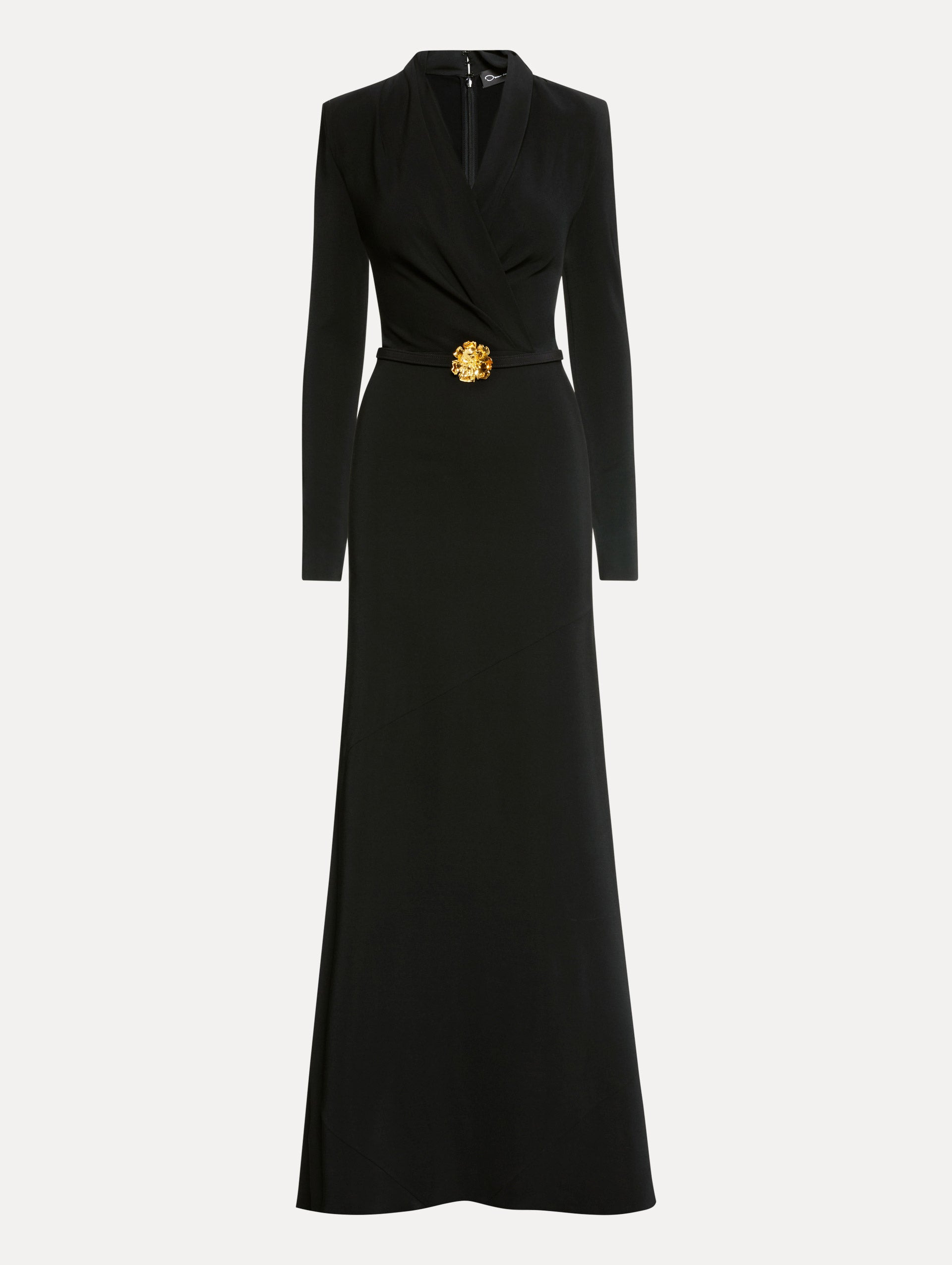 Crafted from stretch cady, this gown features a sleek, sculpted silhouette designed to flatter with ease. A gilded peony belt draws the eye to the waist, offering a romantic counterpoint to the minimalist lines. Details - Long Sleeves - V-Neckline - Floor-Sweeping Hemline with Short Train - Removable, Coordinating Novelty Belt - Concealed Back Zipper - Unlined - Style Code: 25FN006SRY_BLK - Country of Origin: Italy Materials & Care - - 97% Viscose, 3% Elastane - - Dry clean only.