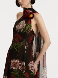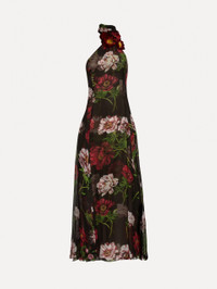 This silk chiffon gown stuns with large-scale peonies in rich, autumnal hues. A wrap-style halter neckline ties like a scarf, falling into a soft train down the back, while a dimensional peony applique at the neck adds a sculptural finishing touch. Details - Sleeveless - Halter Neckline with Scarf Detail - Open Back Concealed Back Zipper - Semi-Sheer - Lined - Style Code: 25FE012PMG_BRU - Country of Origin: Italy Materials & Care - - 100% Silk - - Spot clean only. - - Do not dry clean, iron, steam, bleach, or wash.