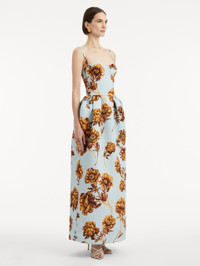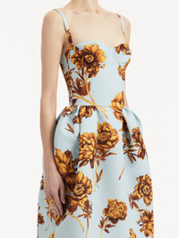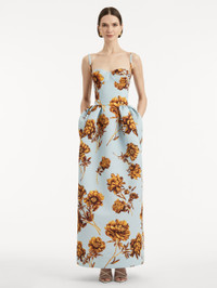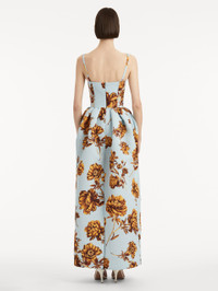Crafted from faille and printed with peonies, this evening gown marries structure with softness. The design features a bustier-style bodice that flatters the form, while a bubble skirt adds sculptural dimension before tapering into a sleek column silhouette. Details - Sleeveless - Bustier Bodice - Side Seam Pockets - Concealed Back Zipper - Center Back Slit - Unlined - Style Code: 25FN013TYF_BIL - Country of Origin: Italy Materials & Care - - 100% Polyester; Lining: 100% Silk - - Dry clean only.