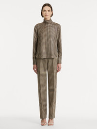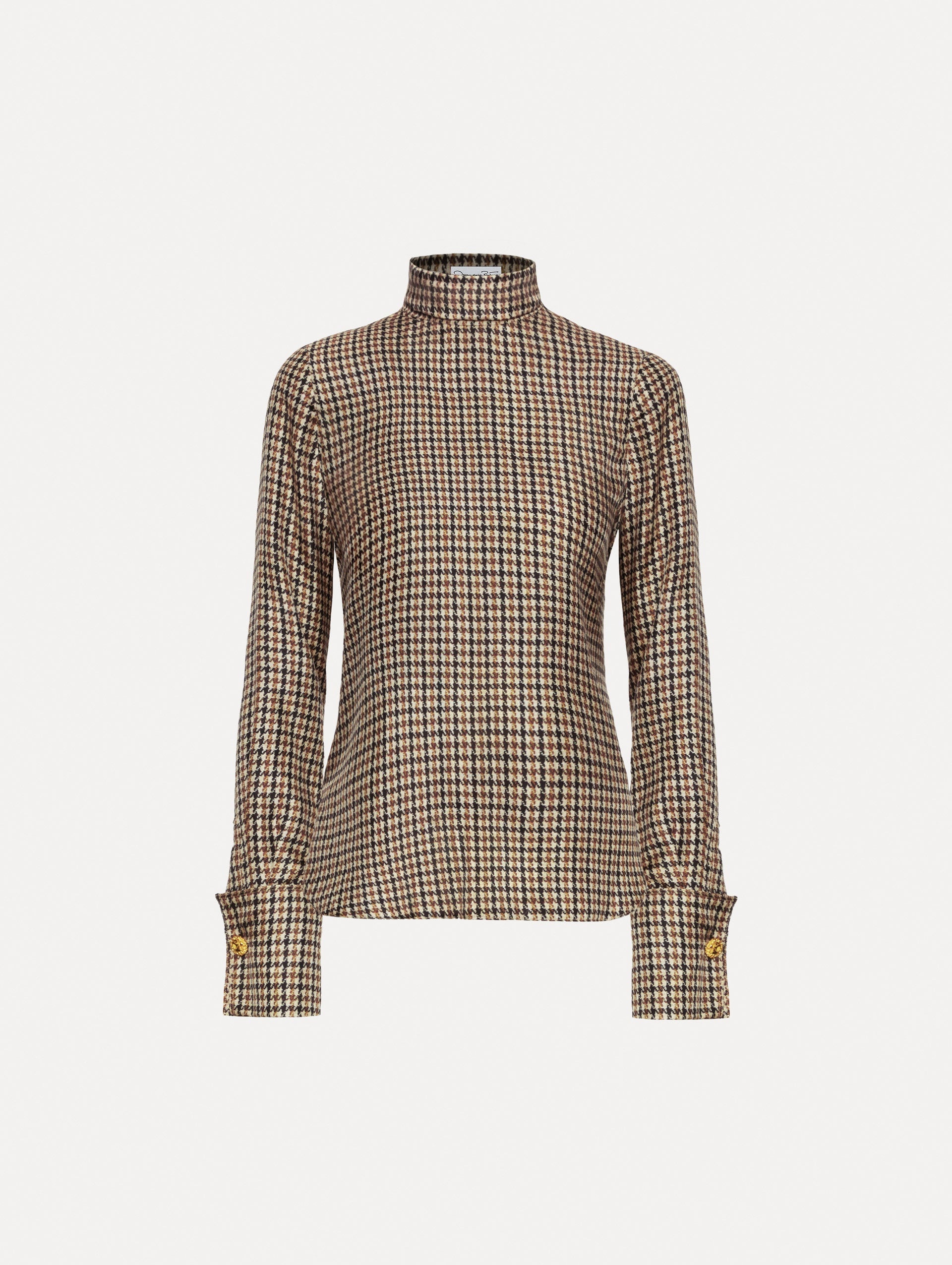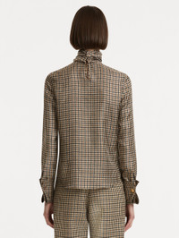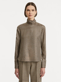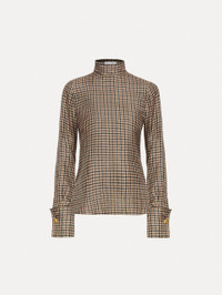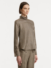 This silk twill blouse, patterned with a classic pied-de-poule, features long sleeves and a sophisticated mock neck. Its smooth, fluid silhouette exudes refined elegance, effortlessly balancing heritage with contemporary style. Details - Long Sleeves with Button Cuffs - Mock Neckline with Hook-and-Eye Closure - Pullover Style - Gold-Tone Hardware - Unlined - Style Code: 25FN719POK_BRU - Country of Origin: Italy Materials & Care - - 100% Silk - - Dry clean only.