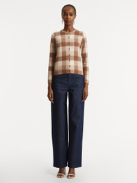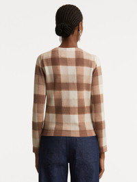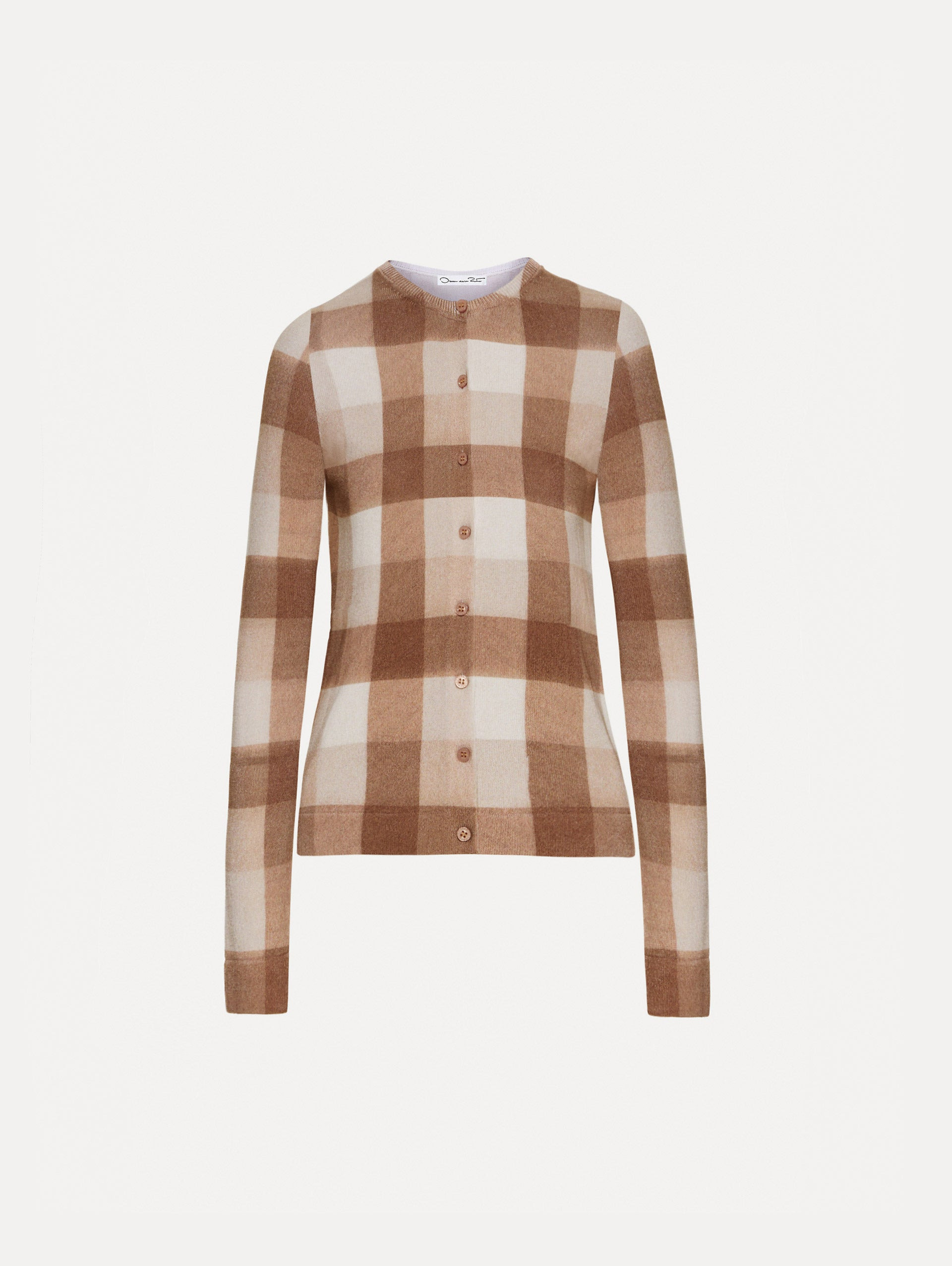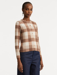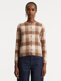This classic ribbed-knit cardigan is printed with a distinctive plaid pattern. This overlayer features a crew neckline and banded trim. Pair with its coordinating tank for an artistic statement. Details - Long Sleeves - Crew Neckline - Button Front - Ribbed Trim - Unlined - Style Code: 25FN125AID_BRU - Country of Origin: Italy Materials & Care - - 57% Cotton, 43% Viscose - - Dry clean only.