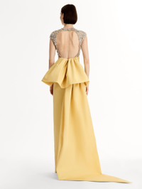 Intricately embroidered with crystal porcelain flowers, this gown combines a sculpted bodice with a dramatic faille skirt. The open back and cascading peplum train create a striking balance of structure and softness, capturing elegance in every detail. Details - Short Sleeves - Jewel Neckline - Open back with Hook-and-Eye Closure - Concealed Back Zipper - Floor-Sweeping Hemline with Short Train - Style Code: 26SE0112FAI_BTR - Country of Origin: USA Materials & Care - 100% Silk; Lining: 100% Polyester - Spot clean only. - Do not dry clean, iron, steam, bleach, or wash.