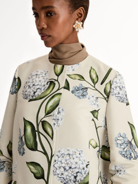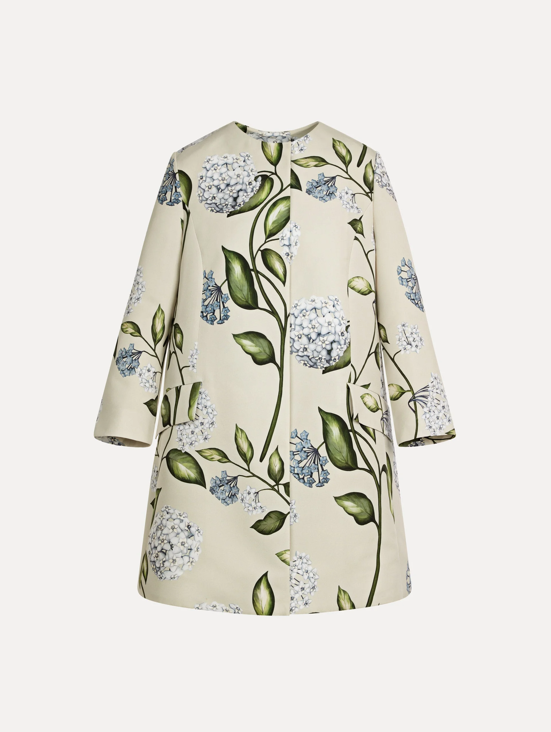 Rendered in structured faille, this short coat showcases the porcelain flower print in full scale, its sweeping botanicals accentuating the clean lines of the silhouette. The midi-length sleeves and concealed front closure lend a modern polish, balancing timeless elegance with contemporary ease. Details - Midi Sleeves - Jewel Neckline - Open Front - Front Flap Pockets - Style Code: 26SN802PLA_DOA - Country of Origin: Italy Materials & Care - 100% Polyester; Lining: 100% Silk - Dry clean only.