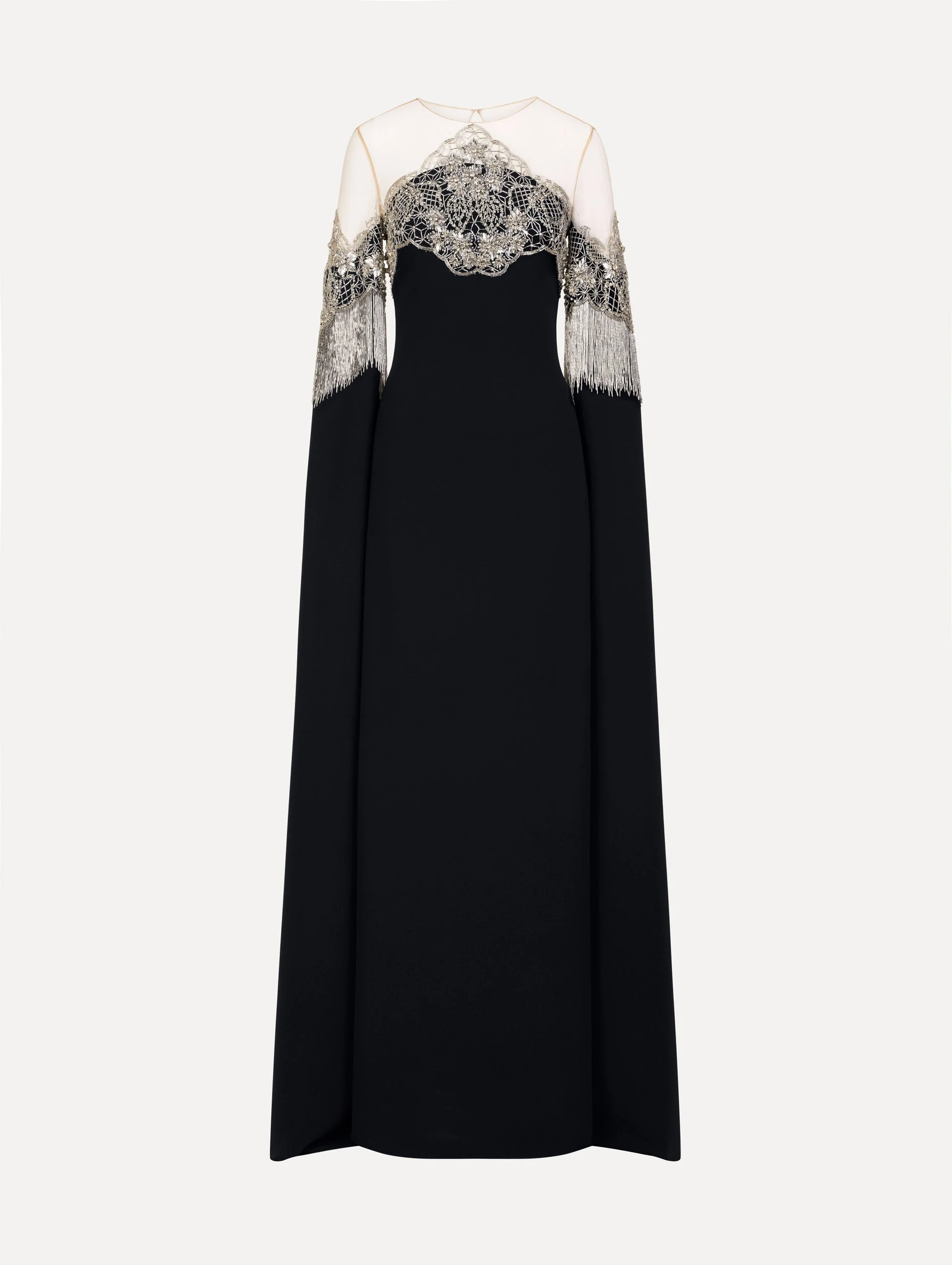 This caftan features an illusion tulle neckline that allows its porcelain flower lattice to appear weightlessly suspended. Hand-applied bugle beads trace each motif, while fluid bugle bead fringe drapes from the sleeves to create soft, shimmering movement. Details - Cape Sleeves - Illusion Neckline - Keyhole Back Closure - Concealed Back Zipper - Style Code: 26SE926HSG_NAV - Country of Origin: INDIA Materials & Care - 94% Silk, 6% Elastane - Dry clean only.