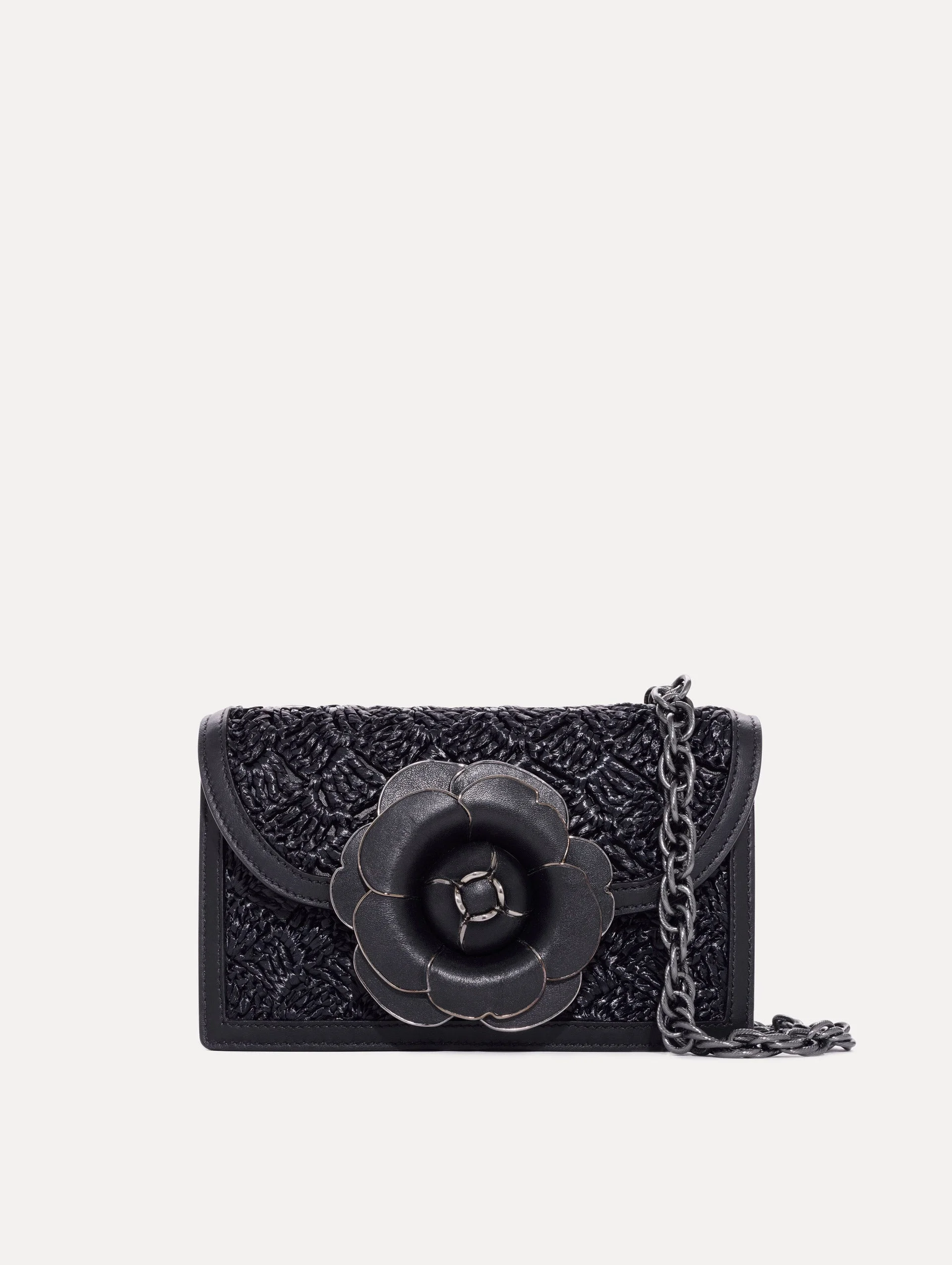 QUINTESSENTIALLY OSCAR, THE CLASSIC TRO BAG IS REWORKED SPRING 2023 IN EYE-CATCHING RAFFIA AND FEATURES A GOLD-EDGED GARDENIA AND CHAIN STRAP. DIMENSIONS: DIMENSIONS: 21CM X 13.5CM X 6.5CM MATERIAL: 60% VISCOSE / 23% POLYAMID /17% COTTON MADE IN ITALY STYLE 23SH407RAF_BLK