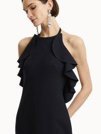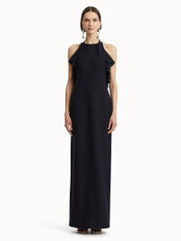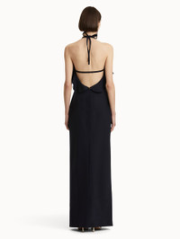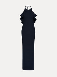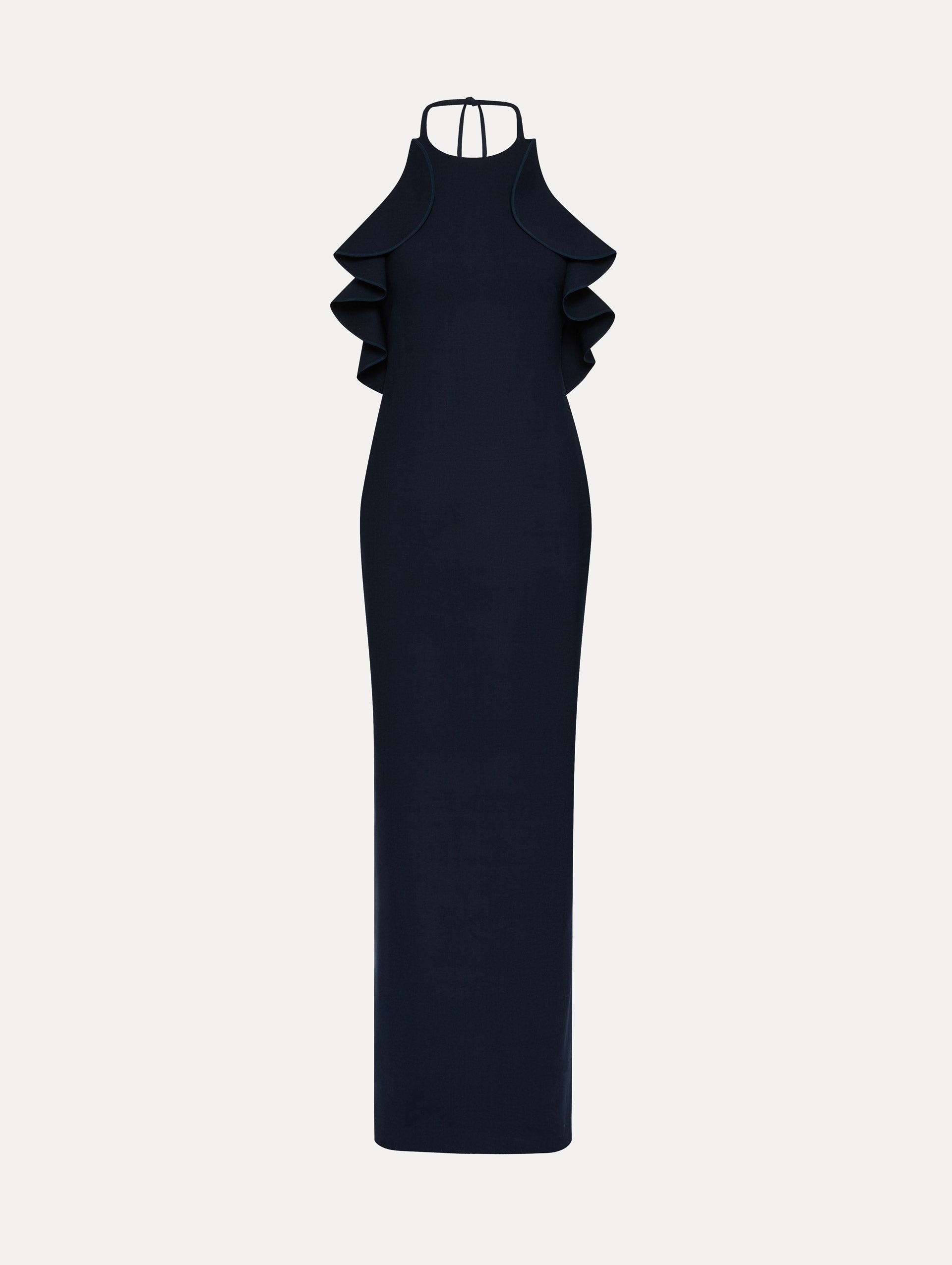 Cut from double-faced stretch wool in a timeless shade of navy, this gown features a sleek column silhouette. The design is elevated by delicate ruffle detailing at the neckline, adding a soft contrast to the gown's streamlined shape. Details - Halter Neckline with Self-Tie Closure - Open Back - Column Silhouette - Floor-Sweeping Hemline - Center Back Slit - Concealed Back Zipper - Unlined - Style Code: 25SN027DSW_NAV - Country of Origin: Italy Materials & Care - 94% Virgin Wool, 5% Elastane, 1% Polyamide; Combo: 100% Silk