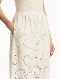 Crafted from intricate scroll guipure lace, these pants offer a delicate balance of texture and movement. The openwork design lends an airy lightness, while the wide-leg silhouette and elastic drawstring waist provide a relaxed, yet refined fit. Details - High Waisted - Elastic Waist with Drawstring - Side Seam Pockets - Wide Leg Silhouette - 100% Silk Lining - Style Code: 25PN313SGP_WHT - Country of Origin: Italy Materials & Care - 100% Polyester; Lining: 100% Silk