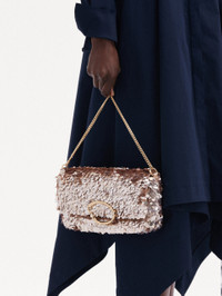 CRAFTED WITH METICULOUS DETAIL, THIS SHOULDER BAG'S SOFT, UNSTRUCTURED SILHOUETTE EXUDES ELEGANCE WHILE OFFERING COMFORT ON THE GO. THE SHIMMERING SEQUINS CATCH THE LIGHT, PERFECT FOR DAYTIME SOPHISTICATION OR EVENING GLAMOUR. TUCK THE GOLD-TONE CHAIN INTO THE INTERIOR TO TRANSFORM IT FROM A SHOULDER BAG TO A SLEEK CLUTCH. INTERIOR POCKET / MAGNETIC CLOSURE / FIXED CHAIN SHOULDER STRAP / LIGHT TAUPE MICROFIBER INTERIOR / FITS UP TO AN IPHONE 14 PRO MAX / SPOT CLEAN DIMENSIONS: 26 CM X 15 CM X 6 CM WEIGHT: 635 GRAMS STRAP LENGTH 100 CM / DROP LENGTH 46 CM MATERIAL: 100% SATIN (68% VI - 32% SE) COVERED WITH NYLON NET WITH PAILLETTES MADE IN ITALY STYLE 24PH019SEQ_CHM