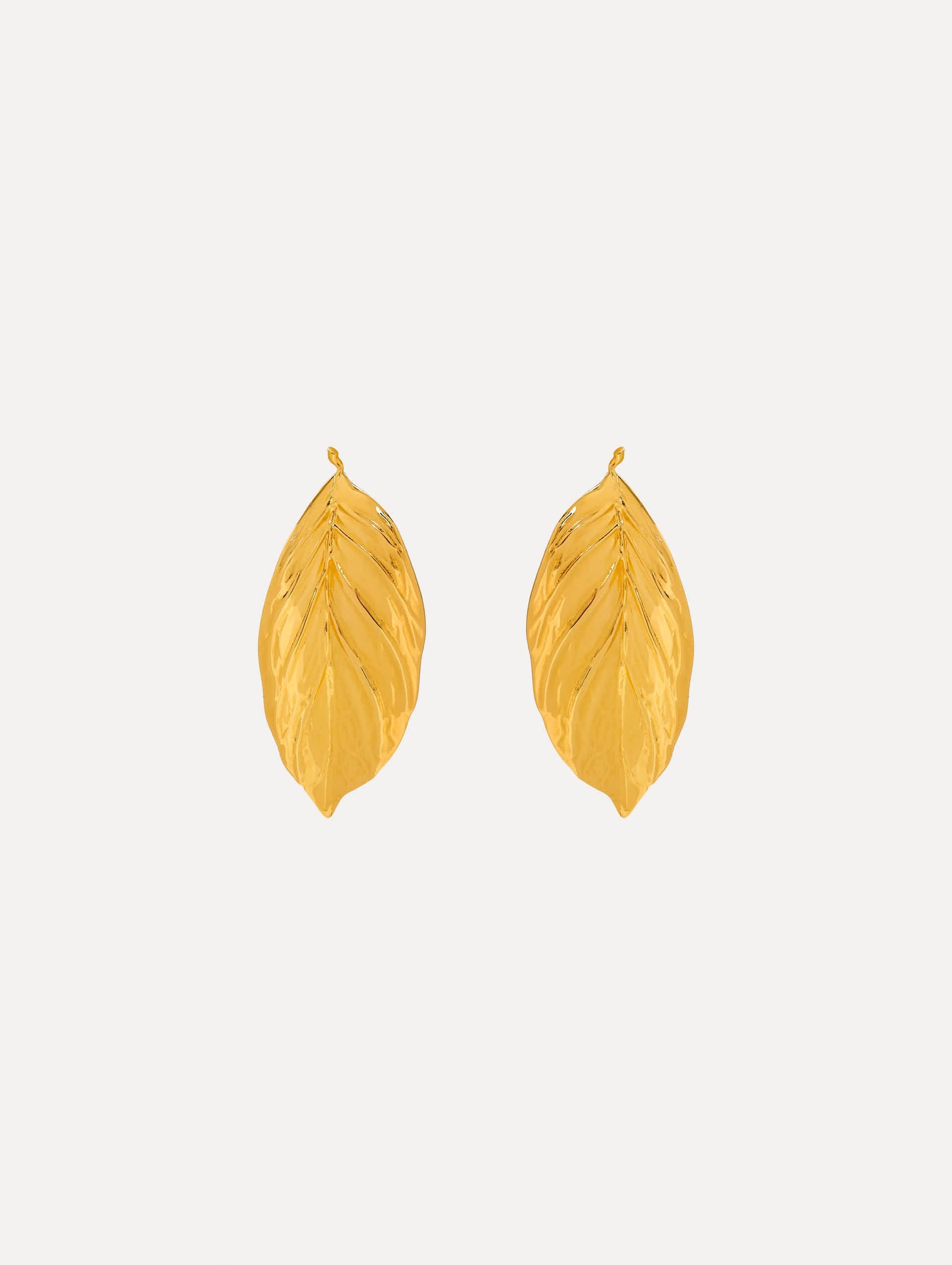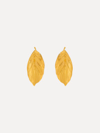 These gold leaf earrings capture the essence of nature's elegance. Sculpted with exquisite detail, each leaf showcases subtle textures, highlighting nature's beauty in its purest form. Details - Dimensions: 30 mm x 13 mm - Weight: 5 grams - Post Backs - For Pierced Ears - Style Code: P25J924_GOL - Country of Origin: Italy Materials & Care - 100% Brass