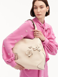 Crafted from full-grain pebbled leather with a refined laser-cut technique, The Topaz tote elegantly embodies Oscar de la Renta’s floral legacy. Designed for versatility, the bag can be worn with two distinct looks: open for a roomy interior or clasped for added security. Detailed with Oscar de la Renta's signature O at the clasp, this tote subtly showcases the brand's heritage, with the curved seams of the bag echoing the graceful curvature of the logo. Details - Dimensions: 40 cm x 34 cm x 16 cm - Weight: 800 grams - Top Handle Drop Length 25 cm - Top Handles - Logo D-Ring Closure - Unlined - Spot Clean - Made in Italy - Style Code: 00NH160ORC_IVR Materials & Care - 100% Calf Leather