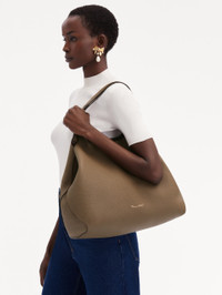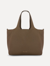 CRAFTED FROM FULL-GRAIN PEBBLED LEATHER, THIS LARGE TOTE SEAMLESSLY BLENDS ELEGANCE WITH VERSATILITY. THE BAG CAN BE WORN WITH TWO DISTINCT LOOKS- EITHER OPEN, ALLOWING FOR ITS SPACIOUS INTERIOR TO ACCOMMODATE ALL OF YOUR DAILY ESSENTIALS OR CLASPED AT THE TOP FOR ADDITIONAL SECURITY. DETAILED WITH OSCAR DE LA RENTA'S SIGNATURE O AT THE CLASP, THIS TOTE SUBTLY SHOWCASES THE BRAND'S HERITAGE, WITH THE CURVED SEAMS OF THE BAG ECHOING THE GRACEFUL CURVATURE OF THE LOGO. TOP HANDLES / LOGO D-RING CLOSURE / UNLINED / SPOT CLEAN DIMENSIONS: 40 CM X 34 CM X 16 CM WEIGHT: 1,000 GRAMS TOP HANDLE DROP LENGTH 25 CM MATERIAL: 100% CALF LEATHER MADE IN ITALY STYLE 00NH160PLT_STN