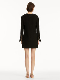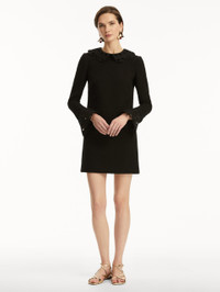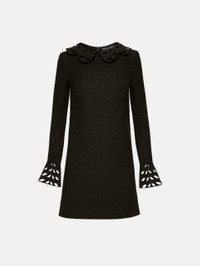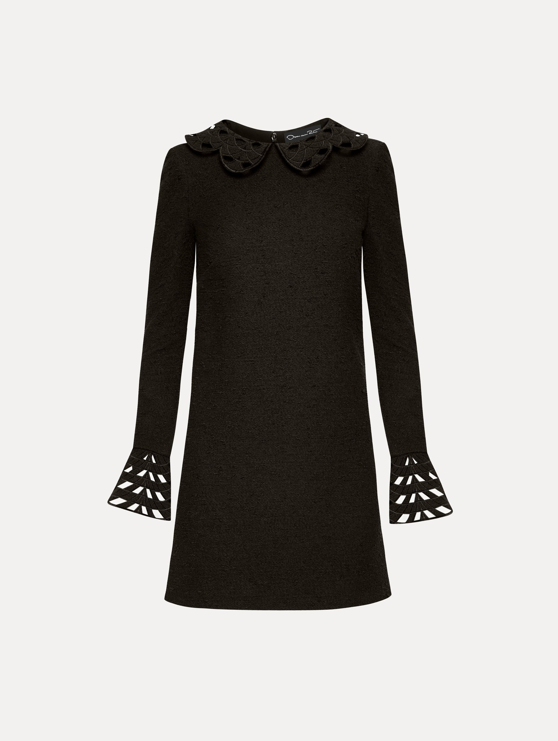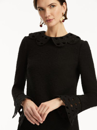 This black cotton-wool tweed shift dress is defined by delicate threadwork cutouts at the scalloped collar and cuffs, merging classic elegance with intricate detailing. Details - Long Sleeve - Spread Collar - Shift Silhouette - Concealed Back Zipper - Lined - Style Code: 25PE244CWD_BAK - Country of Origin: Italy Materials & Care - 64% Cotton, 27% Wool, 9% Polyamide
