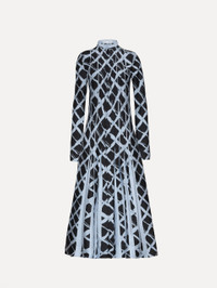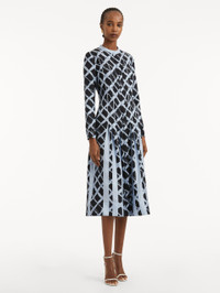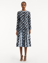 A playful reimagining of classic plaid, this silk twill dress features a fluid grid that trades rigid lines for painterly motion. The pleated bodice lends soft structure to the long-sleeve silhouette, while the skirt falls to contrasting insets that shift with every step Details - Long Sleeves with Button Cuffs - Banded Collar - Concealed Button Front - Unlined - Style Code: 25FN204WTS_NBU - Country of Origin: Italy Materials & Care - - 100% Silk - - Dry clean only.