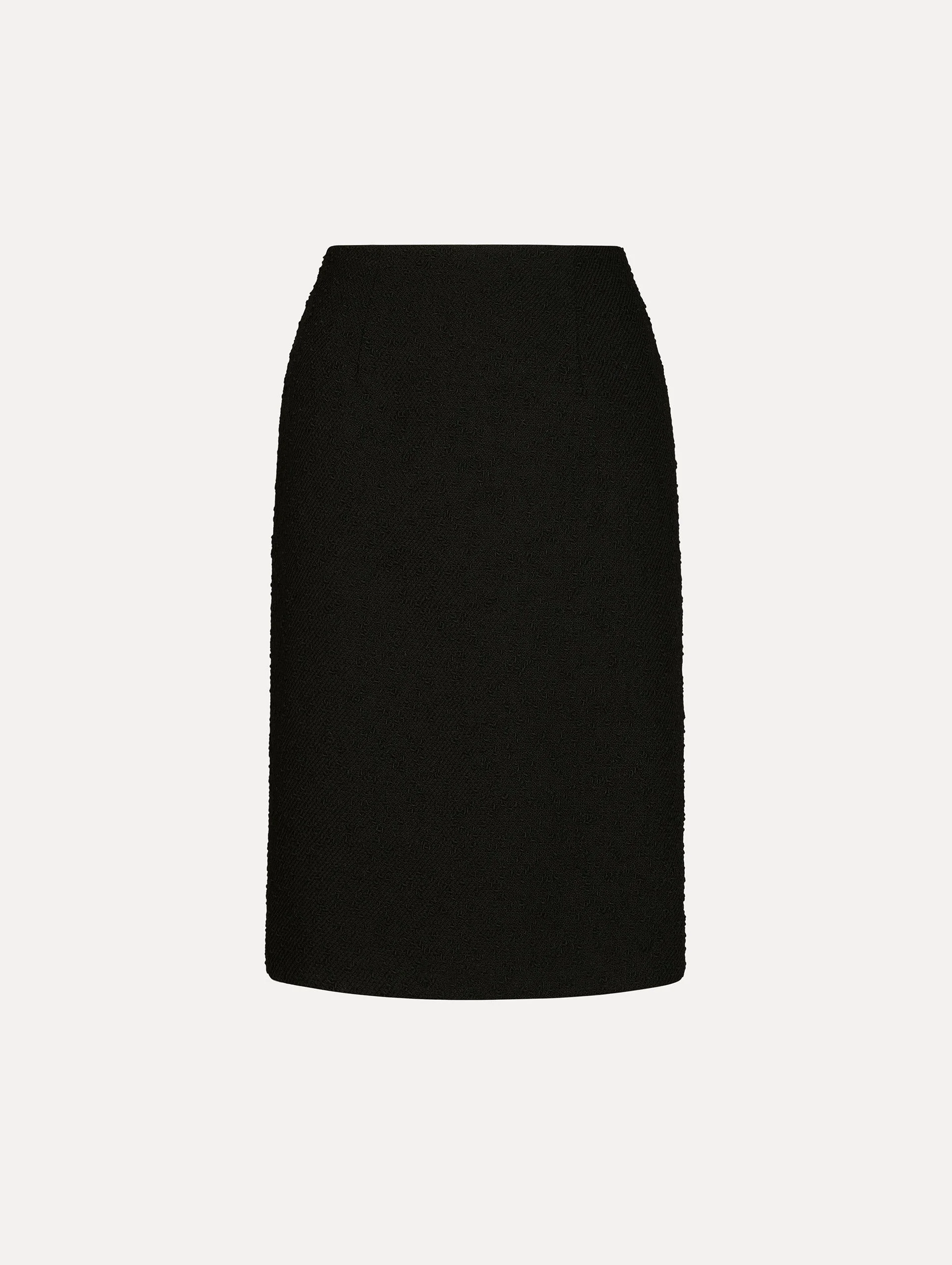 This pencil skirt is tailored from textured tweed that lends subtle depth to its clean, structured silhouette. Refined and timeless, it offers a polished foundation for both day and evening dressing. Details - High Waisted - Banded Waist - Concealed Back Zipper - Style Code: 26SN419SWW_BLK - Country of Origin: Italy Materials & Care - 56% Polyester, 44% Viscose Wool; Lining: 100% Silk - Dry clean only.