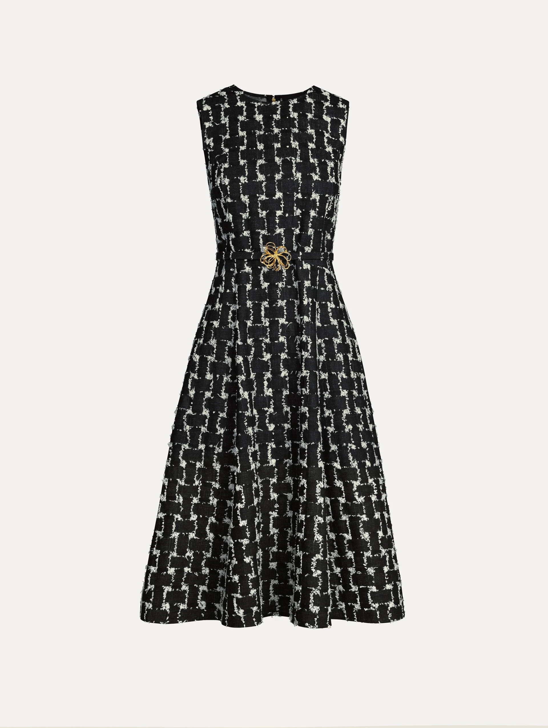 This midi dress is cut from intricately woven denim jacquard, showcasing the fabric’s refined depth and structure. A tailored bodice skims the frame before falling to a flared skirt, creating a striking balance of precision and ease. Details - Sleeveless - Jewel Neckline - Concealed Back Zipper - Unlined - Country of Origin: Italy - Style Code: 26RN2862FDM_IND Materials & Care - 98% Cotton, 2% Elastane; Pocket: 100% Cotton - Dry clean only.