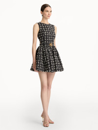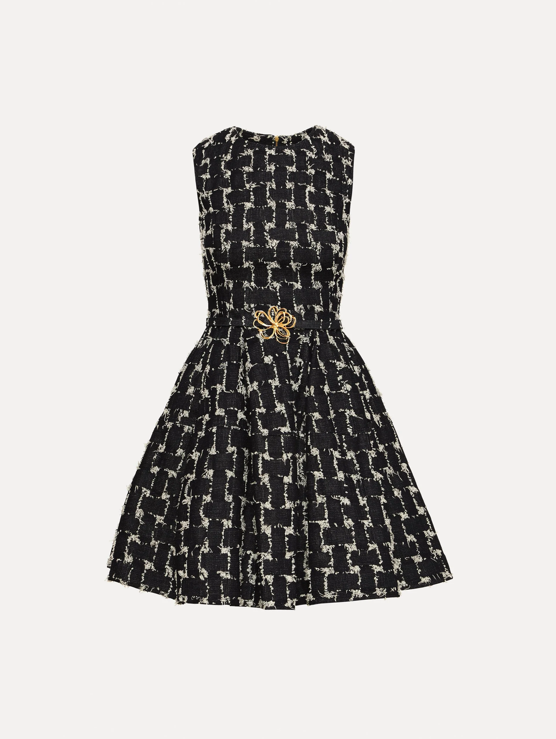 This dress is crafted from frayed denim jacquard, its structured weave bringing depth and dimension to the playful silhouette. At the waist, a sculptural floral belt cinches the shape Pair this piece with the coordinating threaded floral jewelry for a perfectly harmonious finish that echoes the dress’s botanical flare. Details - Sleeveless - Jewel Neckline - Concealed Back Zipper - Side Seam Pockets - Coordinating Novelty Belt - Gold-Tone Hardware - Unlined - Country of Origin: Italy - Style Code: 26RN277FDM_IND Materials & Care - 98% Cotton, 2% Elastane; Pocket: 100% Cotton - Dry clean only.