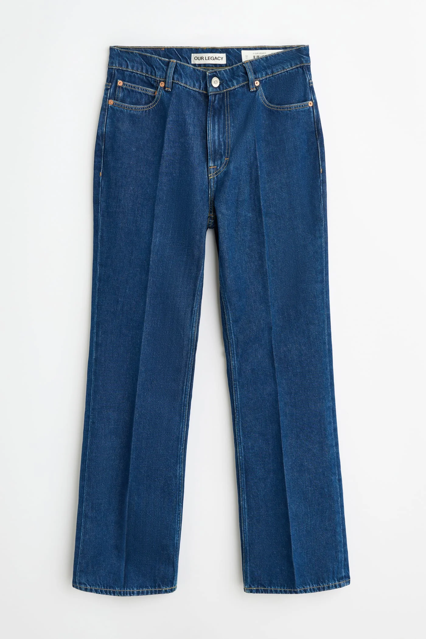 Details · Turkish fabric · 60% Cotton 20% Viscose 20% Polyester · Indigo dyed · Pressed creases · High waist · Straight hip · Boot cut · Five pockets · Steel rivets · Zip fly · M2265SF Description Our 70s Cut in Blue Press Crease. Produced in a indigo dyed Turkish cotton, viscose and polyester blend fabric, the 70s Cut has a high waist with a straight hip and a boot-cut leg, and features pressed creases, five pockets, steel rivets and a zip fly. This garment is crafted from a specially selected polyester fabric, chosen for its unique properties. Due to the characteristics of the polyester yarn, a press-crease effect was achieved through heat treatment applied to the finished garment. The creases will naturally fade over time.