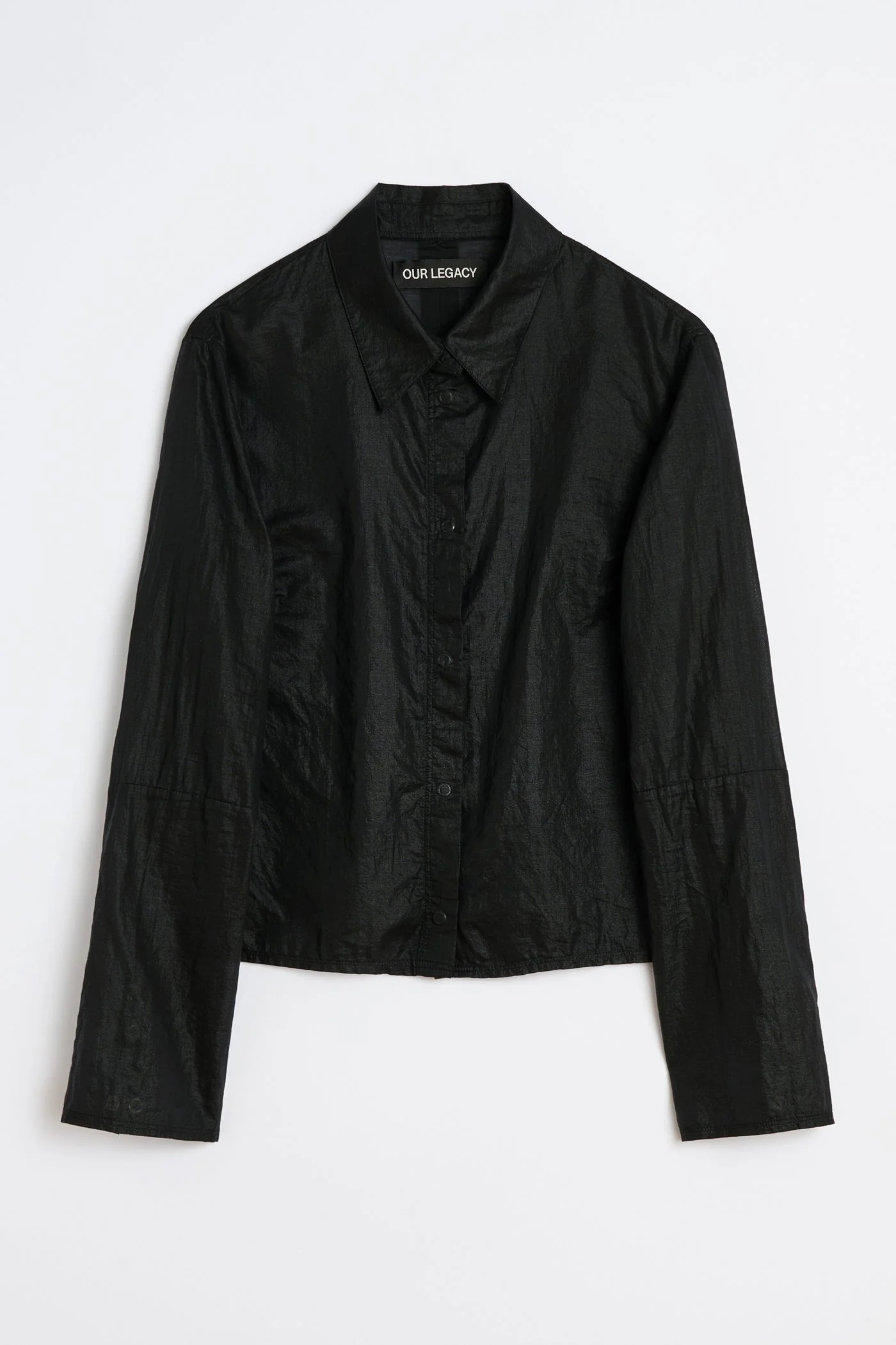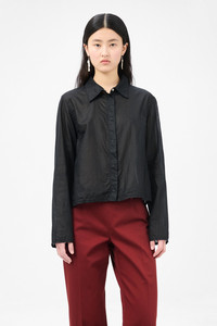 Details · Italian fabric · 100% Cotton · Hidden snap button closure · Darted for shape · French seams · Hidden button cuffs · Straight hem · Regular, boxy fit · W4252AB Description Our Auto Shirt in Black Ink Chintzed Mussola. Produced in Italian cotton fabric, the women's Auto Shirt has a regular, boxy fit and features hidden snap button closure, darted construction for shape, French seams, hidden button cuffs and a straight hem. This garment is manufactured using a fine and delicate material, carefully sourced for its particular characteristics. The garment shall be shaped by its wearer and naturally distress over time to finish the design process.