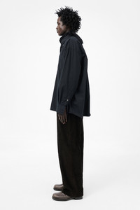 Details · Chinese fabric · 100% Cotton · Lightweight voile · Button down collar · Mother of pearl buttons · Mitered cuffs · Curved hem · Single chest pocket · Oversized fit · MR192BB Description Our Borrowed BD Shirt in Black Voile. Produced in a pigment dyed lightweight cotton voile, this Borrowed BD Shirt has a wide oversized cut and features mother of pearl buttons, a button down collar, a single chest pocket, mitered cuffs and a curved hem.