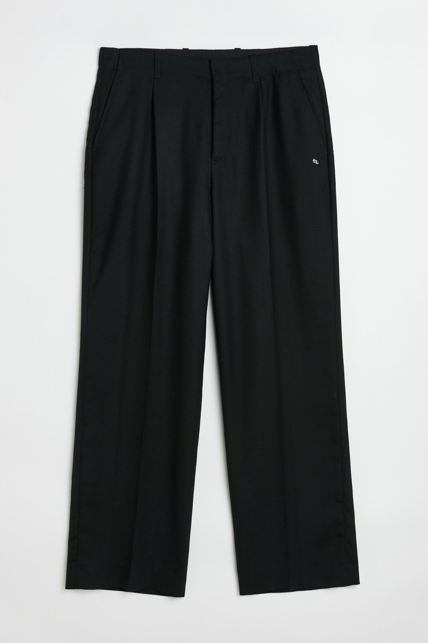 Details · Portuguese fabric · 100% Wool · Fine grain texture · OL embroidery · Pleated front · Two side pockets · Two back welt pockets · Horn buttons · YKK zip fly · Covered hook-and-eye waistband fastening · Wide legged relaxed fit · M421BBPW Description Our Borrowed Chino in Black Panama Wool. Produced in a fine grain Portuguese wool cloth, the mens wide legged Borrowed Chino has a relaxed fit and features front pleats, a YKK zip fly and a hidden hook and eye waist closure.
