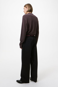Details · Italian fabric · 100% Virgin Wool · Gabardine twill weave · OL embroidery · Pleated front · Two side pockets · Two back welt pockets · Corozo buttons · YKK zip fly · Covered hook-and-eye waistband fastening · Wide legged relaxed fit · M2264BCB Description Our Borrowed Chino in Coarse Black Gabardine. Produced in Italian virgin wool gabardine twill. Gabardine’s tightly woven twill construction delivers durability, wind resistance and a smooth, firm hand. Its diagonal weave lends a sturdy yet refined appearance, balancing structure with drape. The men's Borrowed Chino has a wide legged relaxed fit and features a pleated front, two side pockets, two back welt pockets, corozo buttons, a YKK zip fly and a covered hook-and-eye waistband fastening, finished with OL embroidery.