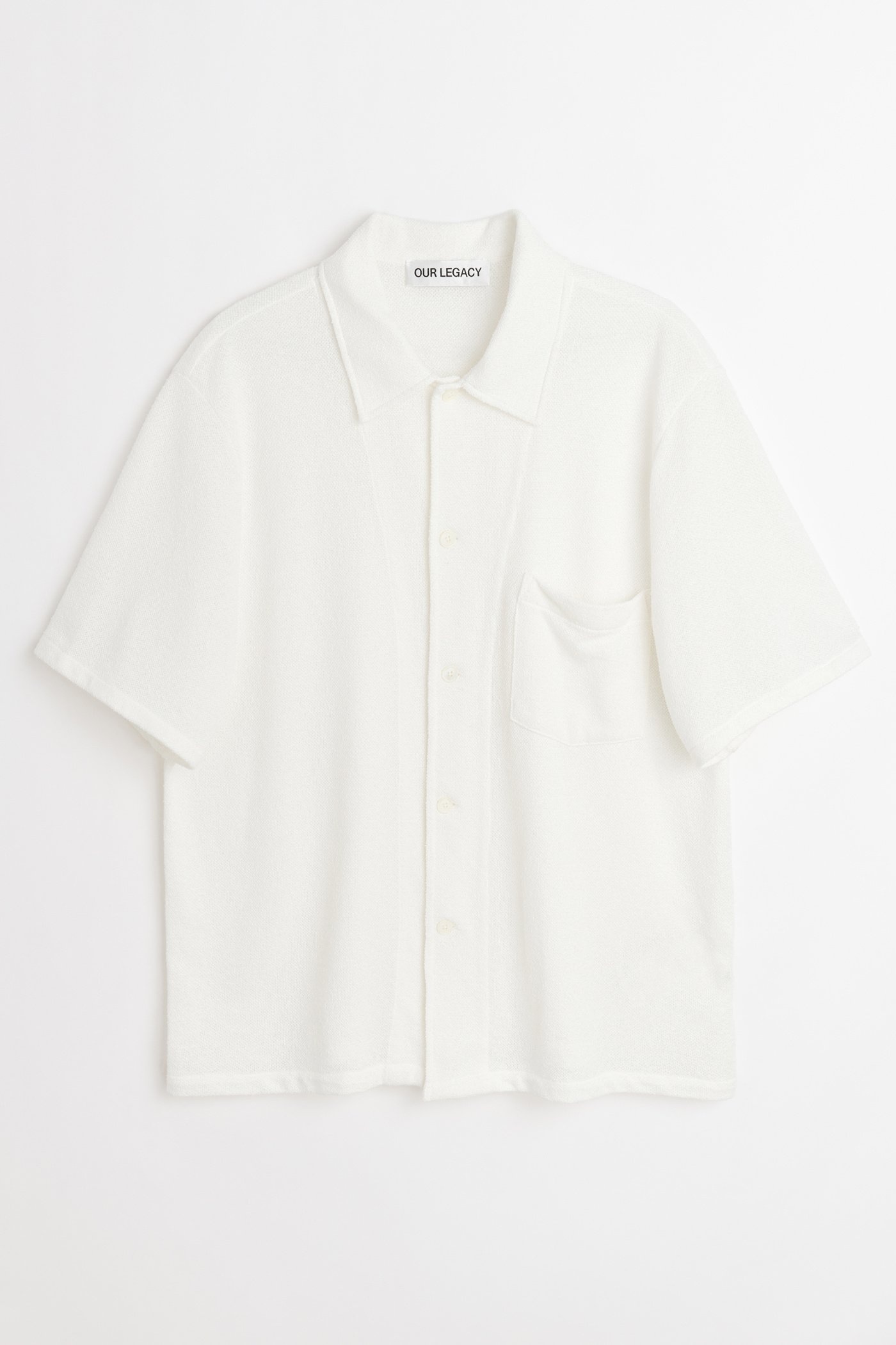 Details · Italian fabric · 49% Cotton 27% Polyester 24% Polyamide · Boucle texture · Mother of pearl buttons · Single chest pocket · Wide placket · Straight hem · Boxy fit · M2202BO Description Our Box Shirt Shortsleeve in White Boucle. Produced in an Italian boucle fabric, the mens Box Shirt Shortsleeve has a boxy fit, and features a single chest pocket, large white pearl buttons and a straight hem.