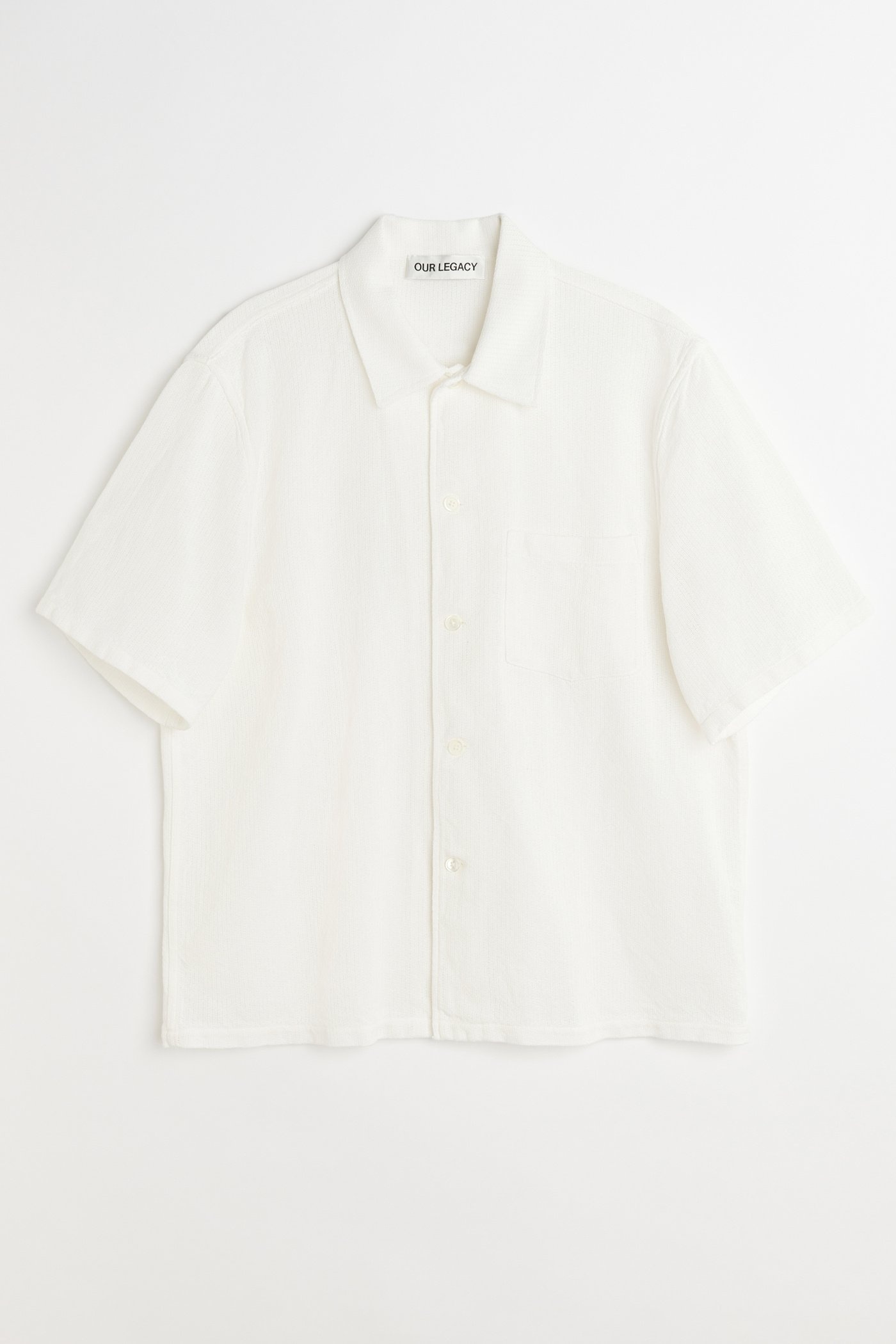 Details · Portuguese fabric · 100% Cotton · Textured crochet weave · Mother of pearl buttons · Single chest pocket · Wide placket · Straight hem · Boxy fit · M2252BWC Description Our Box Shirt Shortsleeve in White Crochet Weave. Produced in a Portuguese cotton fabric with a textured crochet weave, the mens Box Shirt Shortsleeve has a boxy fit, and features a single chest pocket, large white pearl buttons and a straight hem. This garment is manufactured using a delicate material with a naturally loose construction. Please handle with care and wash according to washing instructions. Be especially careful with jewelry and other pointed objects that might harm the surface.