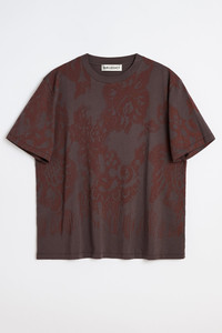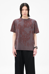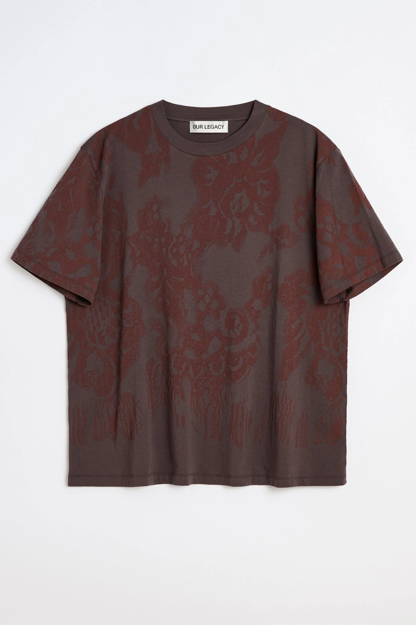 Details · Portuguese fabric · 100% Cotton · Piece dyed · Lace stencil print · Fine rib collar · Straight hem · Wide boxy fit · M4256BRF Description Our Box T-Shirt in Tasty Raisin Lace Stencil. Produced in Portuguese cotton fabric, the men's Box T-Shirt has a wide boxy fit and features piece dyeing, a lace stencil print, fine rib collar and straight hem. This garment is manufactured using carefully sourced material with a unique treatment process that will give each garment an individual shade and appearance. This technique could result in some color bleed onto lighter garments or surfaces. The garment shall be shaped by its wearer and naturally distress over time to finish the design process.