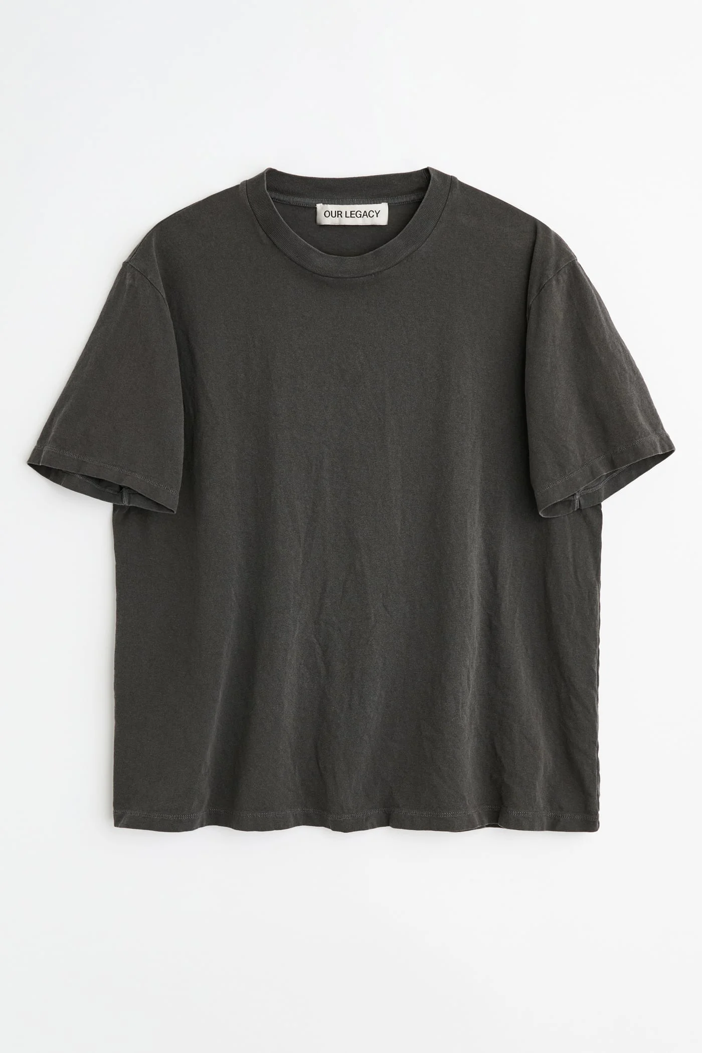 Details · Portuguese fabric · 100% Cotton · Piece dyed · Ribbed collar · Straight hem · Boxy fit · M2266BWG Description Our Box T-Shirt in Worn Graphite Legacy Jersey. Produced in a Portuguese cotton jersey with a pigment-dyed, fade-out finish, the Box T-Shirt has a relaxed, boxy fit and features a ribbed collar and a straight hem, delivering a soft hand and lived-in character with subtle color variations. This garment is manufactured using carefully sourced material with a unique treatment process that will give each garment an individual shade and appearance. This technique could result in some color bleed onto lighter garments or surfaces. The garment shall be shaped by its wearer and naturally distress over time to finish the design process.