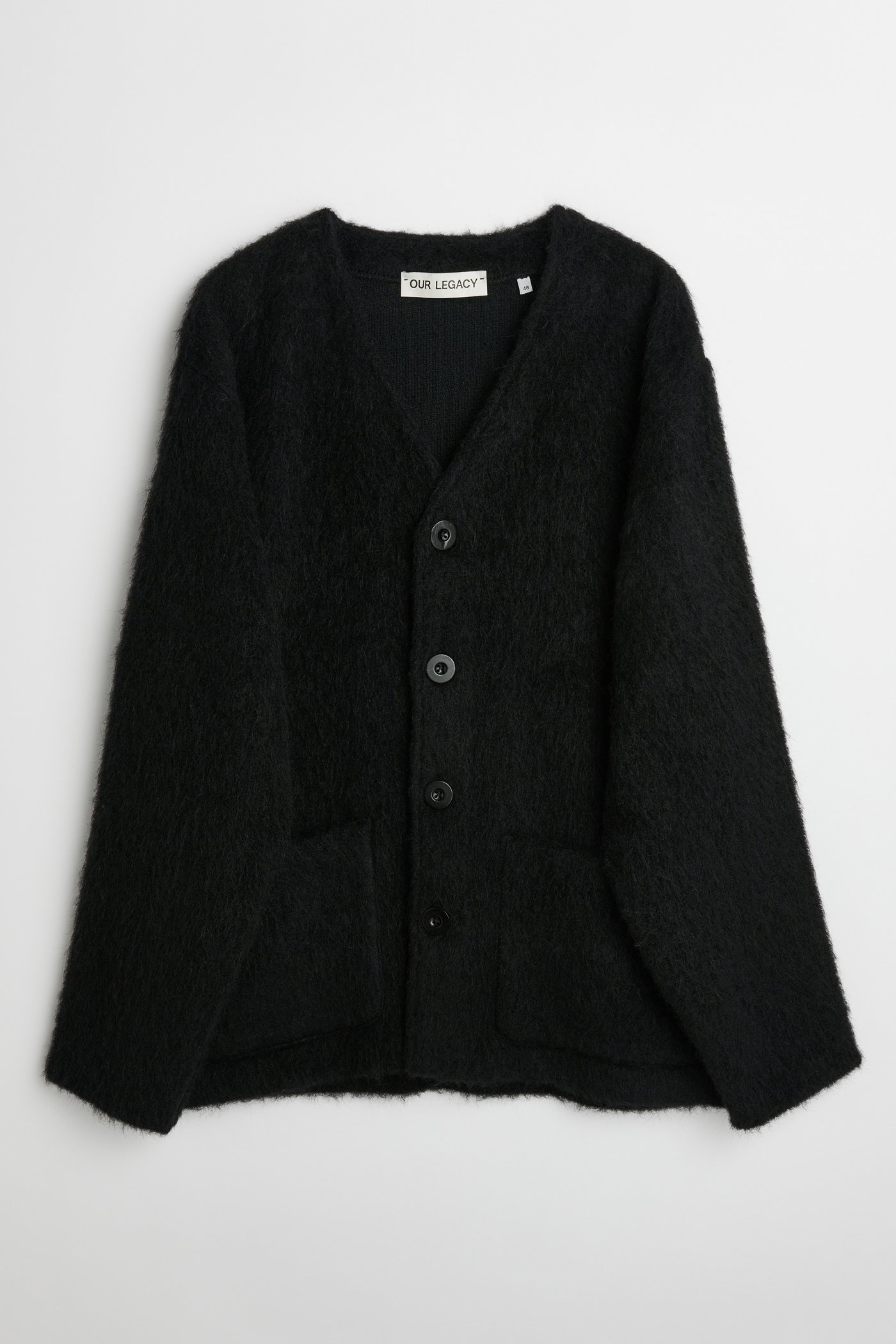 Details · Italian yarn · 36% Wool 26% Polyester 22% Acrylic · 11% Alpaca 3% Polyamide 2% Other fibres · Soft, hairy texture · V neck collar · Bone buttons · Two front pockets · Relaxed fit · M4206CBM Description Our Cardigan in Black Mohair. Produced in a soft Italian wool blend fabric with a hairy texture, the versatile mens Cardigan has a relaxed, boxy fit and features a v-neck collar, two front pockets and bone buttons.
