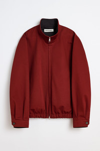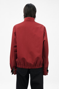 Details · Italian twill fabric · 100% Cotton · Subtle sheen · Contrast inside facing and neckline · Funnel neck collar · Lampo two way zip · Horn button cuffs · Elastic hem · Short boxy fit · M4251CP Description Our Casino Jacket in Profound Red Megatwist Twill. Produced in Italian twill fabric with a subtle sheen, the men's Casino Jacket has a short, boxy fit and features a funnel neck collar, Lampo two-way zip, horn button cuffs, contrast inside facing and necklines, and an elastic hem. The Harrington-inspired style offers Our Legacy's oversized interpretation of everyday staples, sitting on the hips with a relaxed silhouette.