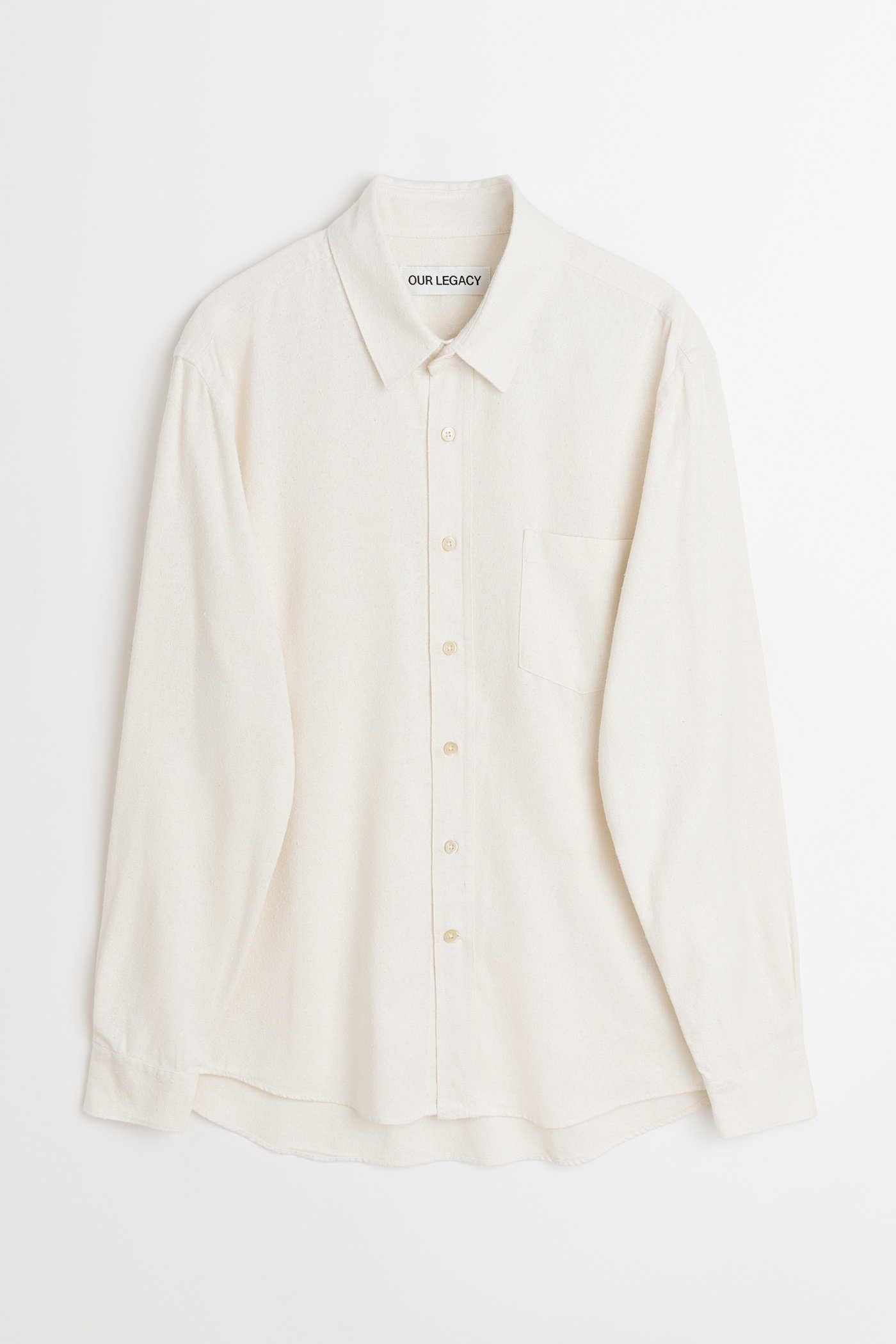 Details · Chinese fabric · 100% Raw Silk · Pigment dyed · Mother of pearl buttons · Single chest pocket · Curved hem · Regular, slim fit · COCSWS Description Our Classic Shirt in White Silk. Produced in a raw silk fabric, the mens Classic Shirt has a regular slim fit and features mother of pearl buttons, a single chest pocket and a curved hem. This garment is manufactured using carefully sourced silk noil fabric. Silk noil is made by recycling the shorter fibers that are left over from the manufacture of other silk fabrics. This process combined with a special pigment dyeing process creates a special structure to the finished garment. There may be traces of alternative fibers and irregularities in weight, color and texture giving each garment a unique appearance.