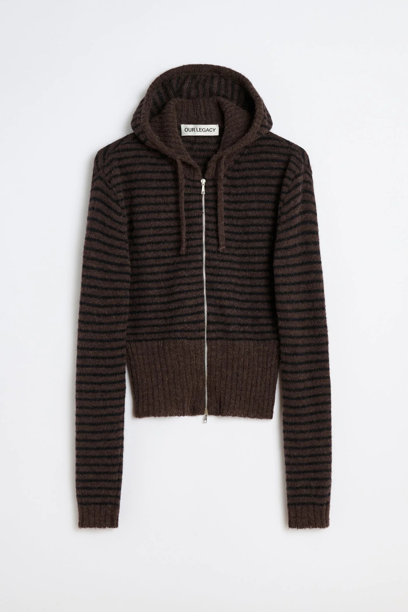 Details · Italian yarn · 55% Alpaca 15% RWS Wool 22% Recycled Polyamide 8% Polyamide · Striped pattern · Drawstring hood · Lampo two way zip · Enhanced ribbed hem · Slim fit · W4253CD Description Our Compact Hood in Dirt Stripe Fuzzy Alpaca. Produced in Italian yarn combining alpaca and RWS wool with recycled polyamide and polyamide, the women's Compact Hood has a slim fit and features a striped pattern, drawstring hood, Lampo two-way zip and enhanced ribbed hem. This garment is manufactured using a carefully sourced yarn. The natural characteristics of the yarn, combined with the construction of the knit allows the garment to expand when worn. The garment shall be shaped by its wearer and naturally distress over time to finish the design process. To help keep the integrity of the garment please store folded.