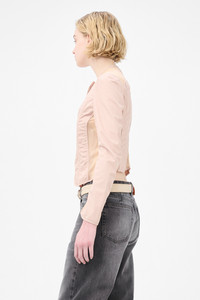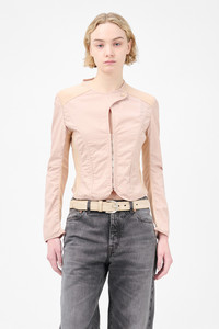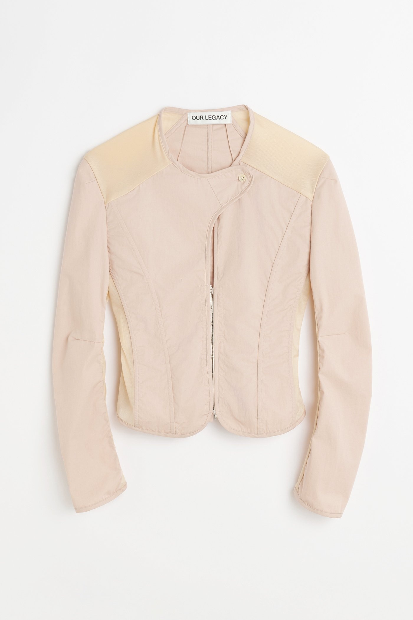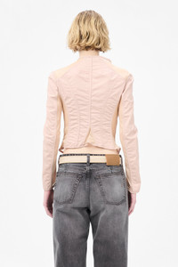 Details · Italian fabric · 100% Cotton · Hook and eye closure · Two way zipped inner layer · Paneled construction · Contrast mesh segments · Button flap at neckline · Darted, cropped fit · W2252CP Description Our Corset Jacket in Powder Rouge Sanded Poplin. Produced in an Italian cotton fabric, the women's Corset Jacket has a darted, cropped fit and features a two way zipped inner layer, a front placket with hook and eye closure, contrasting fabric panels and a flap with button closure. This garment is manufactured using a delicate material with a naturally loose construction. Please handle with care and wash according to washing instructions. Be especially careful with jewelry and other pointed objects that might harm the surface.