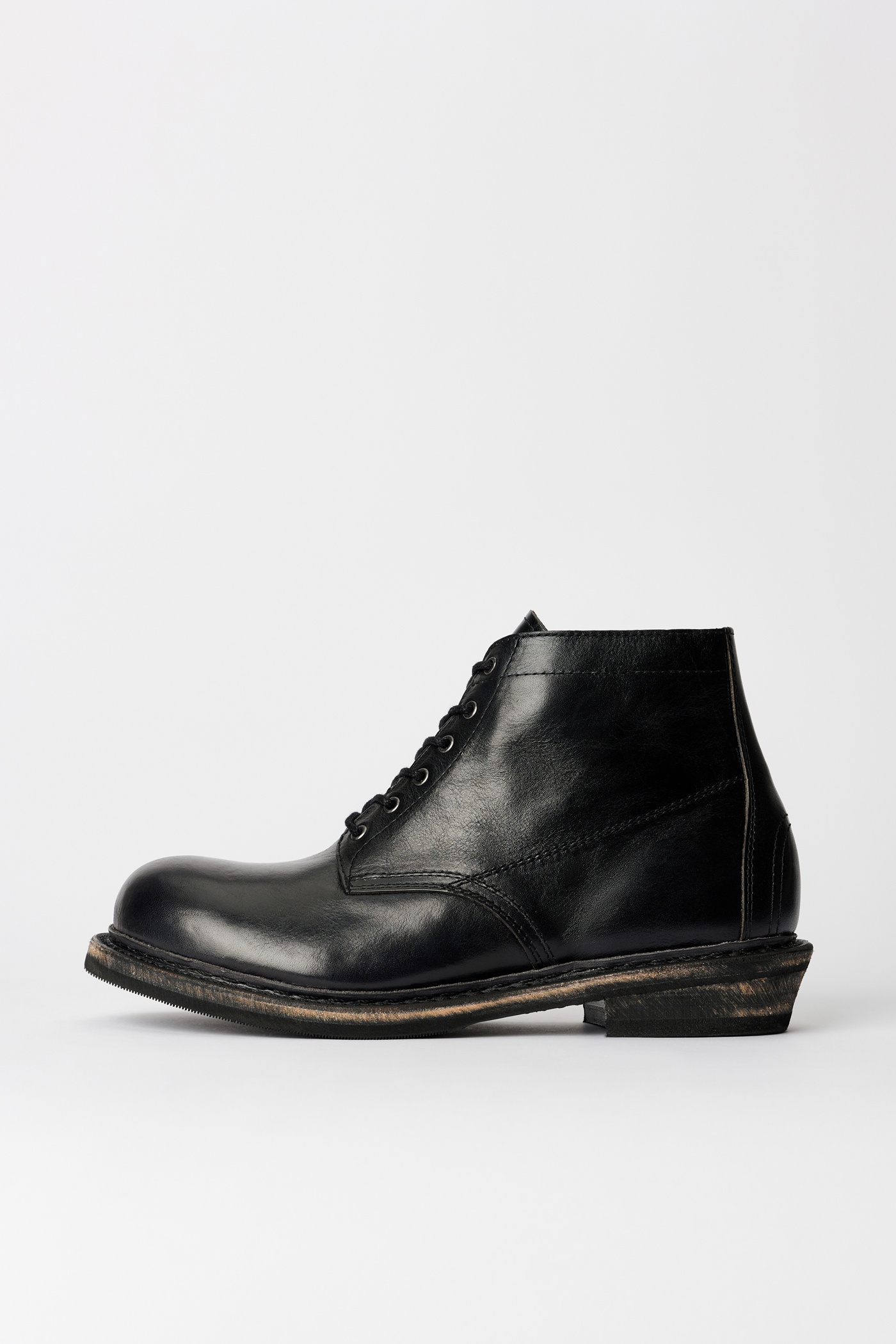Details · Italian leather · Mid cut · Vibram lugged sole · Kilger leather midsole from Germany · Lace closure · Metal eyelets · Our Legacy metal rivet on tongue · A4247CDB Description Our Cortege Boot in Deep Black Leather. Produced in an Italian leather, the mid cut Cortege Boot features a lugged Vibram sole, lace closure with metal eyelets and a metal Our Legacy rivet on the tongue. This product is crafted from carefully sourced leather. As a natural material, leather carries subtle traces of the animal's life. These natural imperfections bring a unique character to each product, expressing an original and authentic look. The product shall be shaped by its wearer and naturally distress over time to complete the design process.