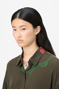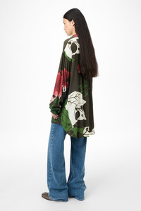 Details · Italian fabric · 100% Rayon · Hell Of Ween print · Frill shoulders · Petit collar · Cuffs with tab · Mother of pearl buttons · Curved hem · Oversized fit · W4252DH Description Our Dapper Shirt in Hell Of Ween Print. Produced in Italian rayon fabric, the women's Dapper Shirt has an oversized fit inspired by vintage men's formal shirts and features frill shoulders, petit collar, curved hem, mother of pearl buttons, and cuffs with tabs that fasten with button and buttonhole. The shirt combines long and oversized proportions with feminine details to create a perfect contemporary style for women.