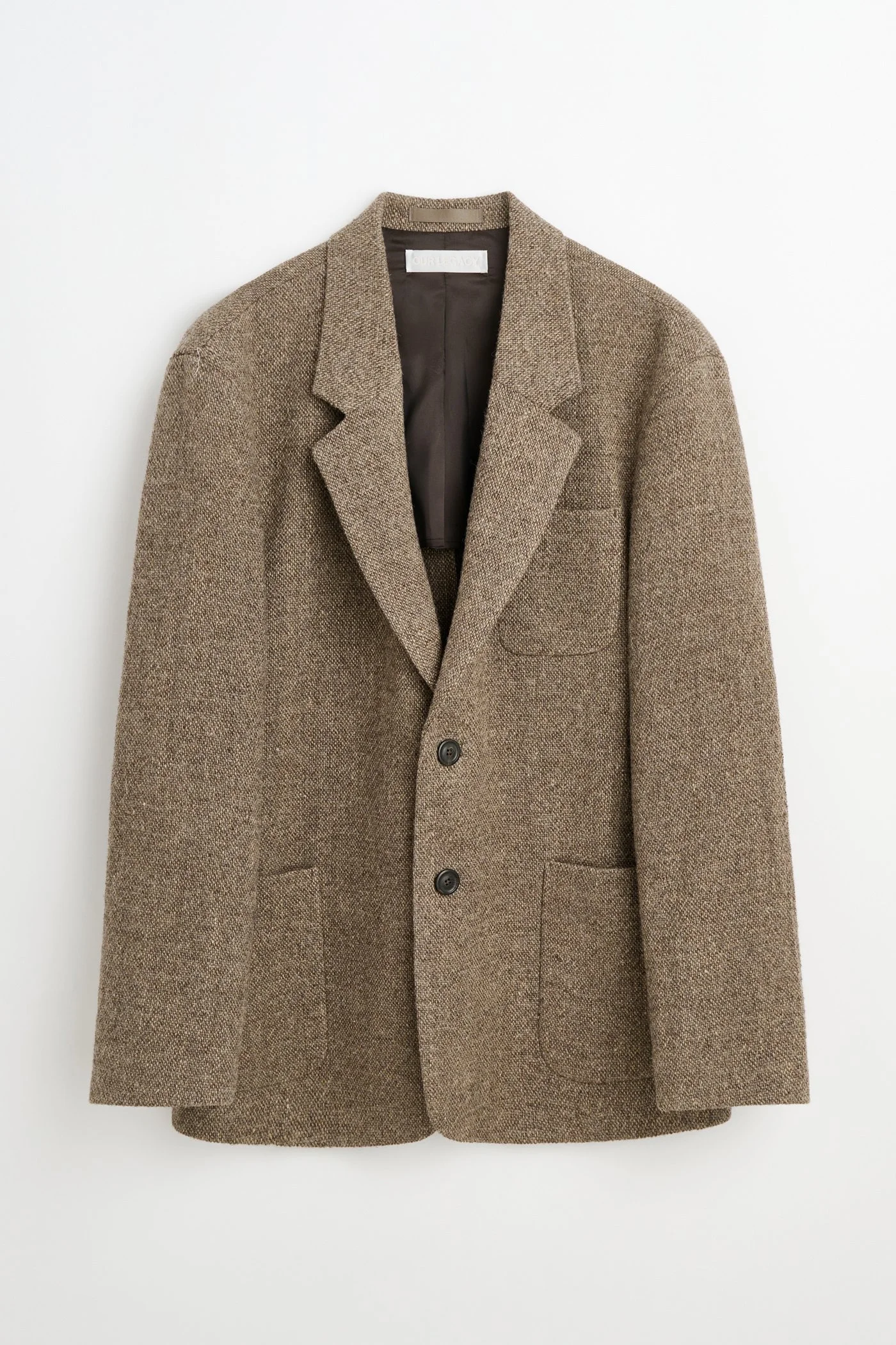 Details · Italian fabric · 50% Virgin Wool 50% Hemp · Textured weave · Notched lapel · Angled chest pocket · Earthhorn two button closure · Patch pockets · Half lined · Oversized silhouette · M4250EN Description Our Embrace Blazer in Natural Brown Sack Weave. Produced in Italian fabric blended from virgin wool and hemp, the men's Embrace Blazer has an oversized silhouette and features a notched lapel, an angled chest pocket, earthhorn two button closure, patch pockets and half lining. This garment is manufactured using a delicate material with a naturally loose construction. Please handle with care and wash according to washing instructions. Be especially careful with jewelry and other pointed objects that might harm the surface.