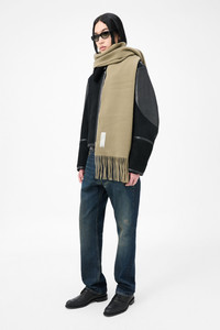 Details · Italian fabric · 100% Wool · Soft, hairy fabric · Twisted fringes · OUR LEGACY woven label · Rectangular shape · A4258EMG Description Our Estate Scarf in Olive Double Wool. Crafted from luxurious Italian wool with a soft, hairy texture, this rectangular scarf features elegantly twisted fringes at both ends and is finished with an OUR LEGACY woven label. The scarf measures 220 cm x 27 cm including fringes.