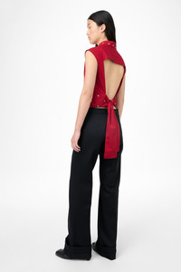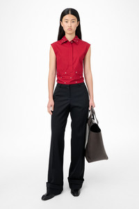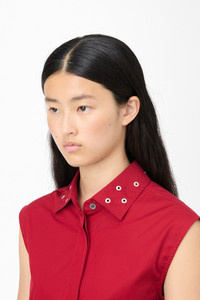 Details · Italian fabric · 100% Cotton · Super poplin fabric · Sleeveless design · Hidden button placket · Cutaway collar · Girdle belt ties at back · Short yoke with exposed back · W4252GLR Description Our Girdle Top in Lipstick Red Super Poplin. Produced in cotton poplin fabric, the women's Girdle Top is a sleeveless style with a relaxed fit and features a hidden button placket, cutaway collar, a short yoke on the back with the rest of the back being exposed, and a girdle belt that ties at the back. This garment features placed eyelets as a distinctive design feature, adding texture and visual interest. Care should be taken when wearing the piece, as the eyelets may catch on or snag delicate fabrics.