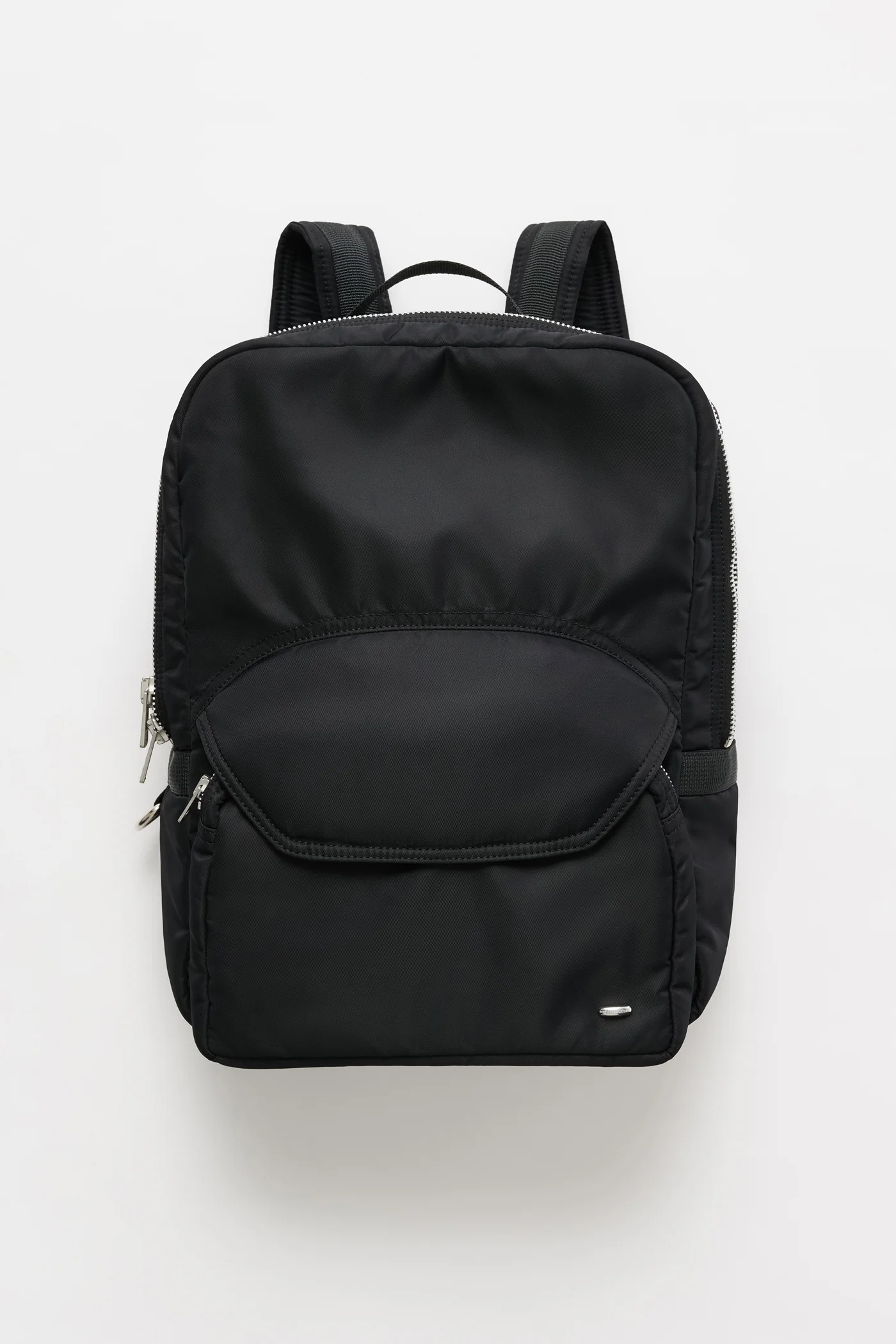 Details · Italian fabric · 100% Polyamide · Large central pocket · Inner laptop pocket · Mesh inside pocket · Lampo zippers · Outside button flap closure pocket · Adjustable shoulder straps · Metal Our Legacy rivet · A2248GCB Description Our Grande Volta Backpack in Cayce Black. Produced in a Italian polyamide fabric, the Grande Volta Backpack has adjustable shoulder straps, a large central compartment, a laptop inside pocket, an external zip and button flap closure pocket. Dimensions: 43 cm x 38 cm x 14 cm