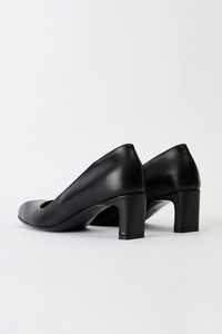 Details · Italian leather · Vegetable tanned · 5 cm block heel · Angular toe shape with beak-like front · Thin leather sole · Leather covered block heel · Fitted last with pointier toe · Wide opening design · A4257PBT Description Our Karasu Pump in Black Tensile Cattle Hide. Produced in Italian vegetable-tanned leather with a rubbery touch and soft shine, the women's Karasu Pump features a fitted last with a distinctive angular, beak-like toe shape that creates the signature Karasu family silhouette. The pump stands on a thin leather sole with a 5cm thin leather-covered block heel that widens towards the front for a refined, minimalist aesthetic. This product is crafted from carefully sourced leather. As a natural material, leather carries subtle traces of the animal's life. These natural imperfections bring a unique character to each product, expressing an original and authentic look. The product shall be shaped by its wearer and naturally distress over time to complete the design process.