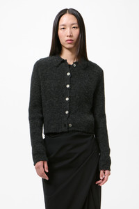 Details · Italian fabric · 55% Alpaca 22% Recycled Polyamide · 15% Recycled Wool 8% Nylon · Fuzzy, textured knit · Smoke mother of pearl buttons · Point collar · Elongated sleeves · Slightly cropped fit · W2263MCM Description Our Mazzy Polo in Charcoal Melange Fuzzy Alpaca. Produced in an Italian knit fabric blending alpaca, recycled polyamide, recycled wool and nylon, the Mazzy Polo has a slightly cropped fit with elongated sleeves and features a fuzzy, textured knit construction, a point collar and smoke mother of pearl buttons. This garment is manufactured using a carefully sourced yarn. The natural characteristics of the yarn, combined with the construction of the knit allows the garment to expand when worn. The garment shall be shaped by its wearer and naturally distress over time to finish the design process. To help keep the integrity of the garment please store the garment folded.