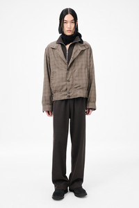Details · Japanese fabric · 65% Polyester 35% Rayon · Plaid Check · Funnel neckline · Bomber style · Pleated waistband and cuffs · Hornite Buttons · Relaxed fit · M4252MD Description Our Mock Bomber in Dirty Brown Glen Plaid. Produced in Japanese polyester and rayon blend fabric, the men's Mock Bomber has a relaxed fit and features a funnel neckline, pleated waistband and cuffs, and horn buttons. Taking inspiration from bomber jackets, this design skips the traditional knitted ribs on the cuffs, collar and waistband, instead using multiple pleats that create soft flow, volume and drape throughout the piece.